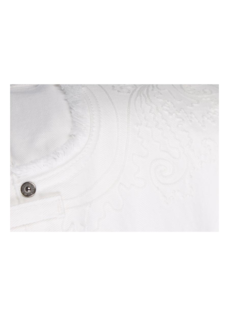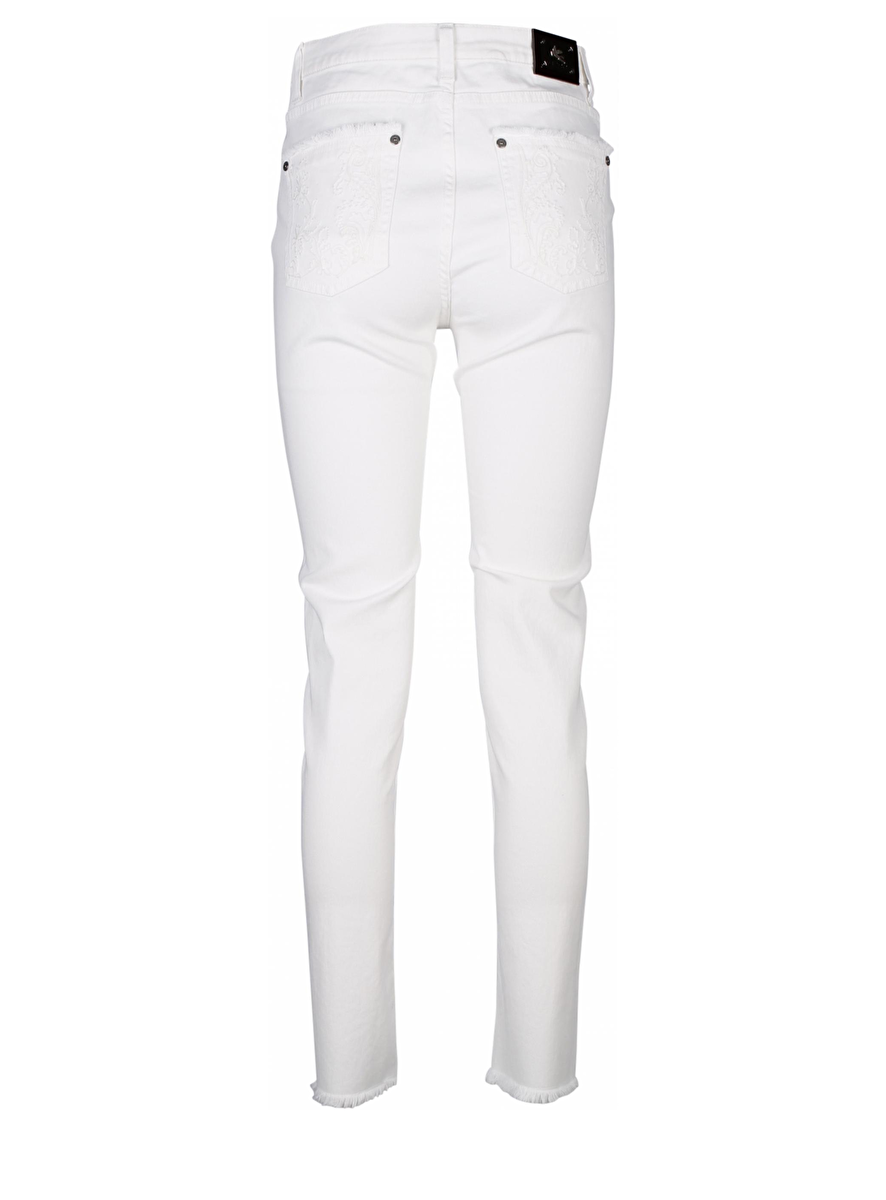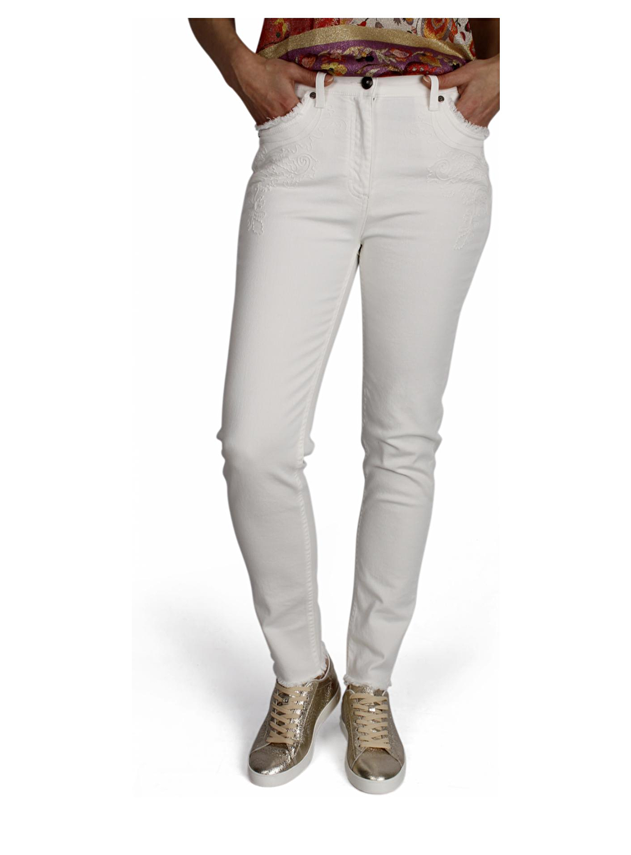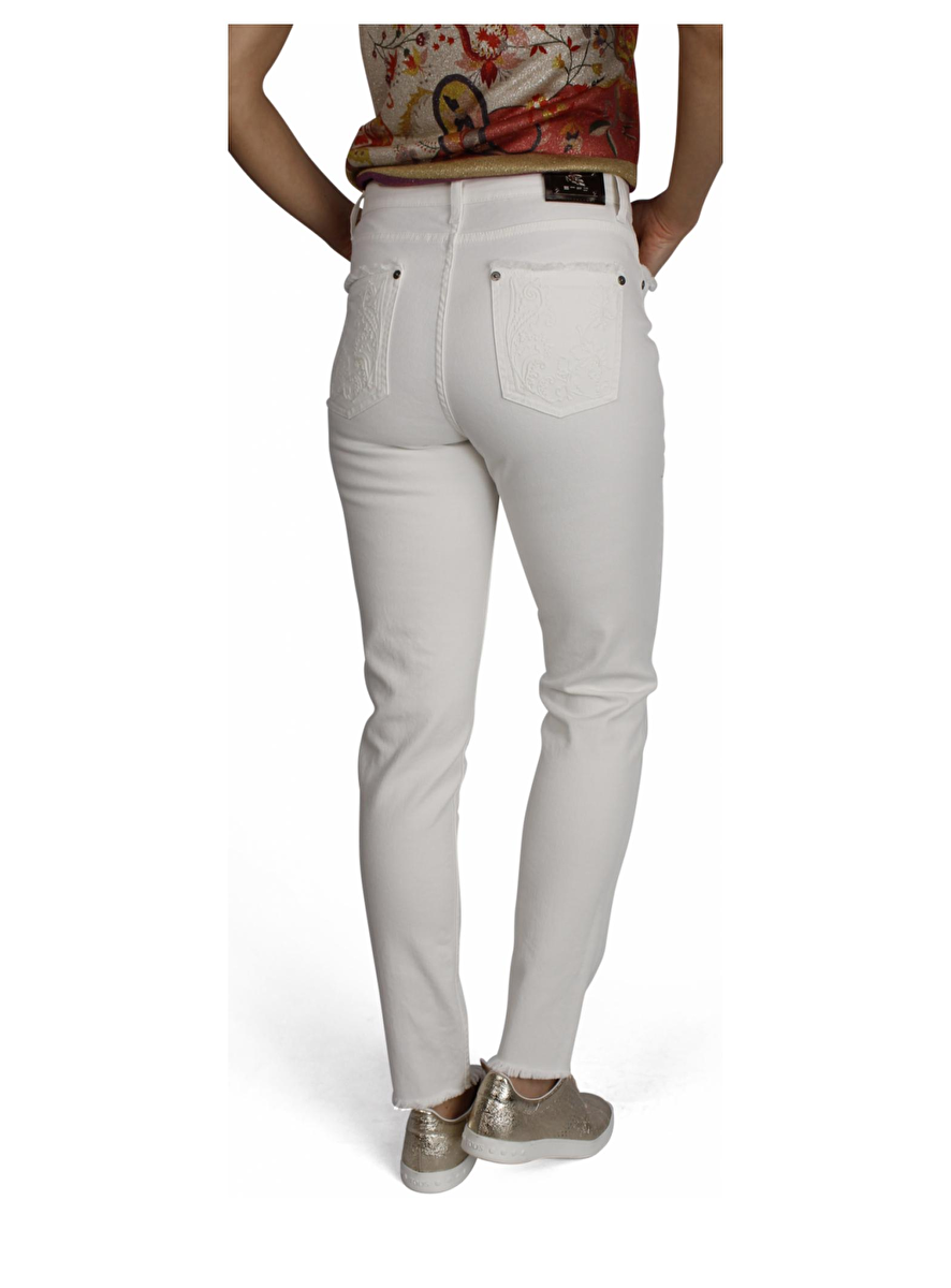 Deze offwhite jeans van Etro heeft aan de voor en de achterkant ton sur ton borduursels. Aan de bovenkant van de zakken fijne franje randen deze zitten ook aan de onderkant (de zoom) van de broek. Aan de taille is het logo van Etro verwerkt in een metaalplaatje met leder.