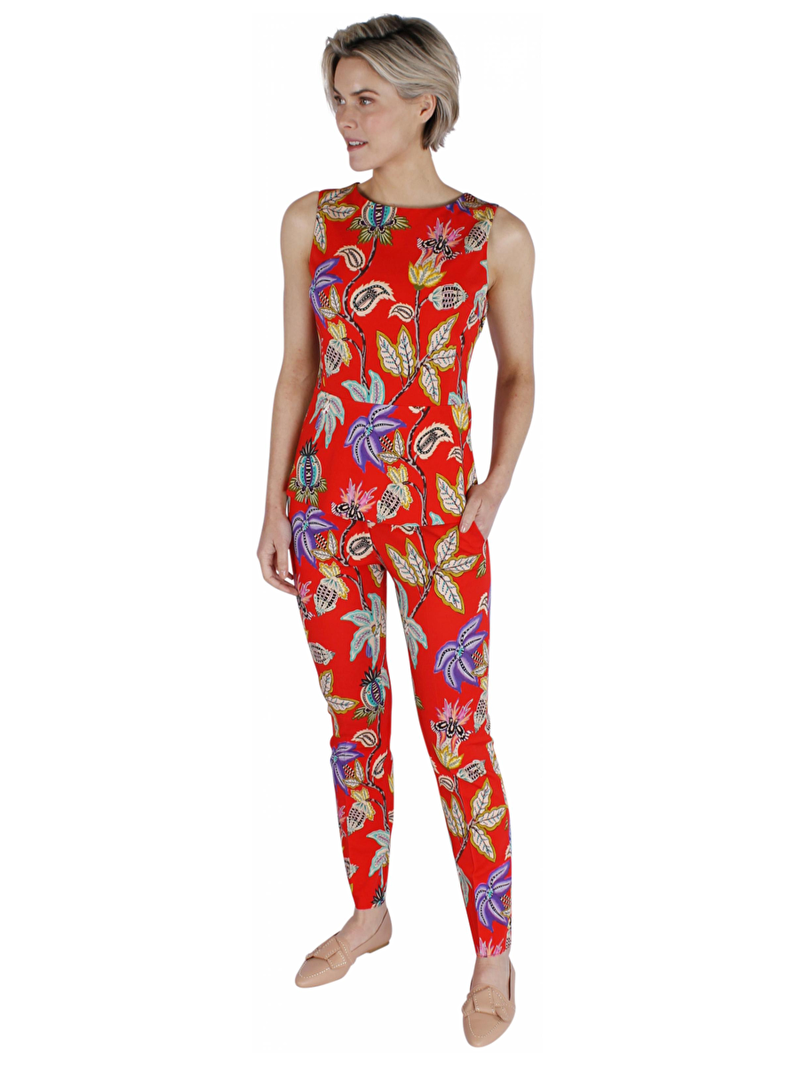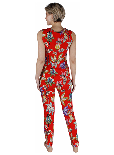 Wat een prachtige rode, oranje pantalon! Deze broek heeft een fel bloemen motief en als je goed kijkt hebben ze kleine lieve gezichtjes. Aan de zijkant van de broek steekzakken en aan de achterkant een sierzakje. De taille heeft lussen voor een mooie riem.