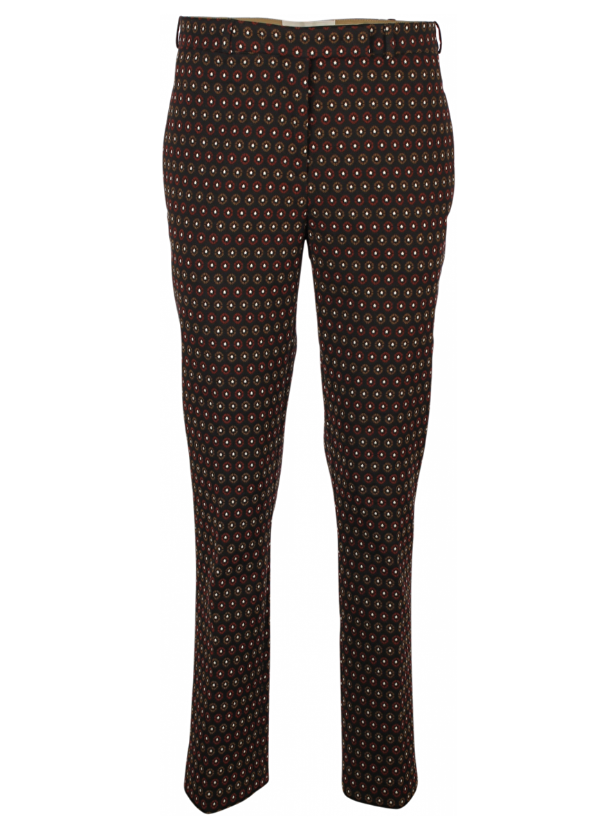 Pantalon uitgevoerd in een cirkel dessin in de wit, rood en okertinten. Deze pantalon is strakgesneden en heeft een mooie slanke pasvorm. De pantalon heeft twee steekzakken. Aan de achterkant ook een zakje met een knoopje. De pantalon heeft lusjes zodat er eventueel ook een ceintuur op gedragen kan worden. Het materiaal bestaat uit 67% katoen, 30% polyamide en 3% elastan.