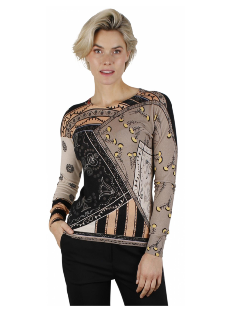 Super zachte pull van Etro uitgevoerd in beige en zwart met diagonale dessins in de kleuren zacht geel, lavendel blauw en roze tinten. Door het dessin ontstaat er een mooi effect. De pull heeft een aansluitende pasvorm.