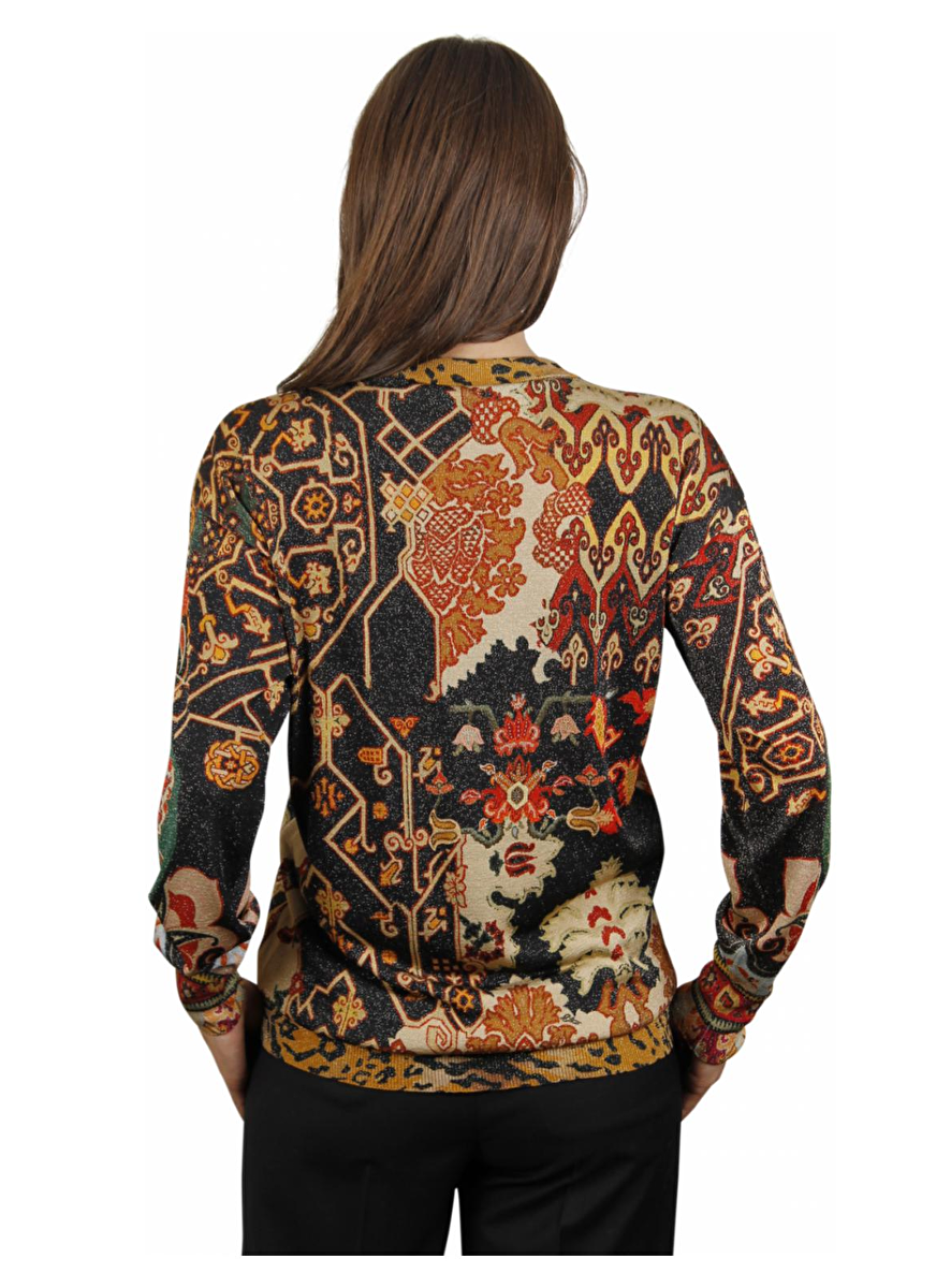 Goud glinsterende pull van Etro in multicolor. De hoofdkleuren zijn warm camel, cognac, roodtinten, groen, blauw en zwart. De hals is rond, het geheel sluit mooi vrouwelijk aan. Het dessin is abstract, blad en paisley.