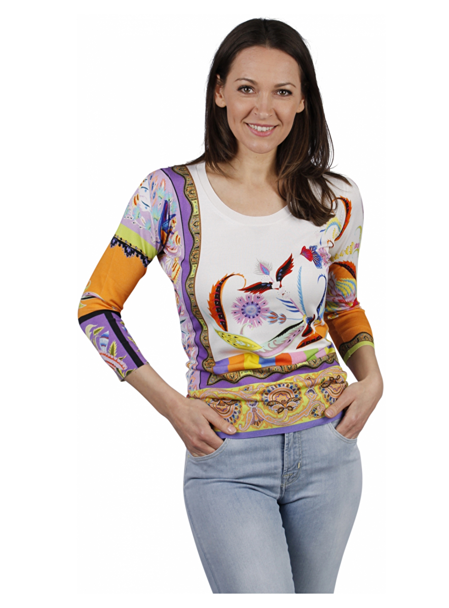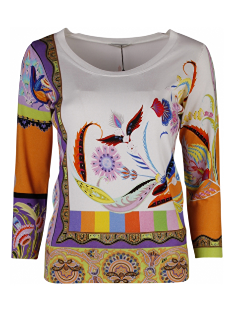 Pull in 85% zijde met 15% elasthan. De basis is offwhite en de print is heel fris gekleurd met oranje, lila, roze en andere kleuren. De pull heeft een ronde hals en de mouwen zijn 3/4 van lengte.