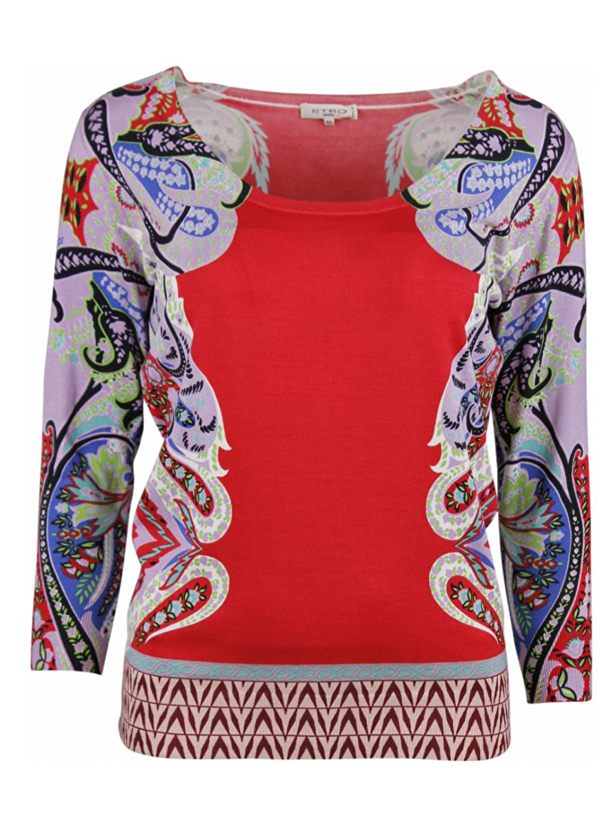 Zijde pull in rood, zwart, paars paisley en abstract dessin. Deze heeft een diepe ronde hals en lange mouwen.