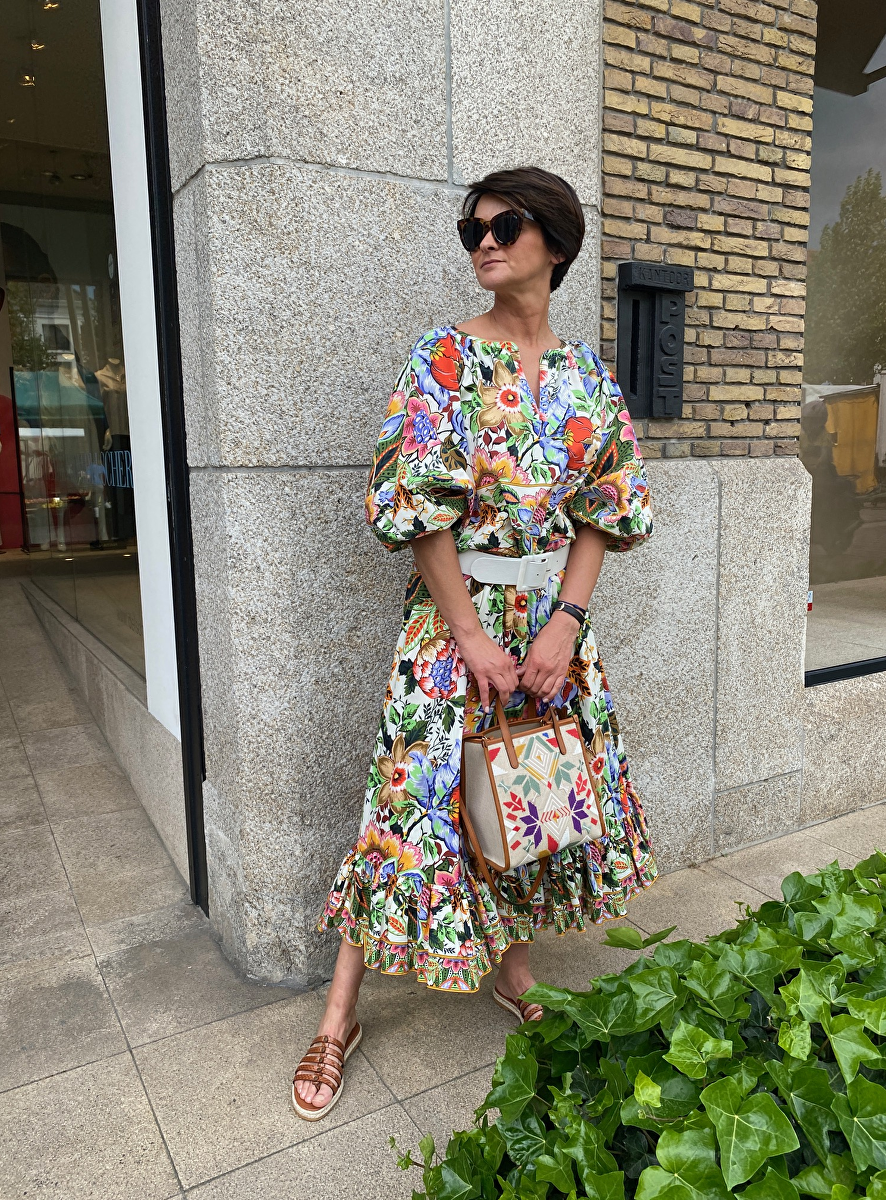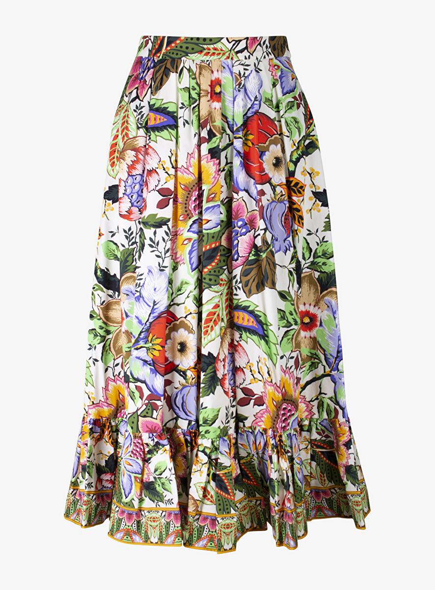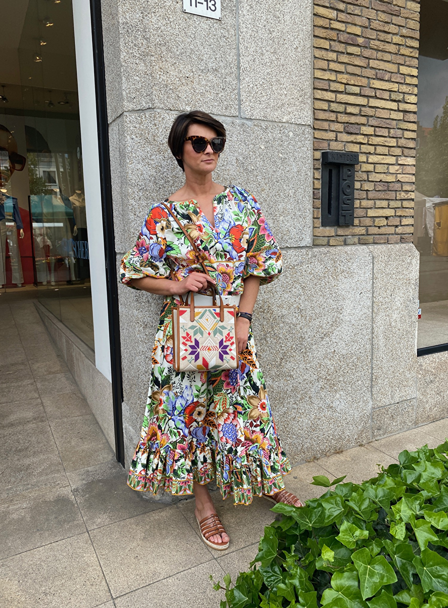 Detail: bloemenprint allover - volants aan de onderkant zoom - achterkant ritssluiting met haakje - steekzakken in de zijnaad.