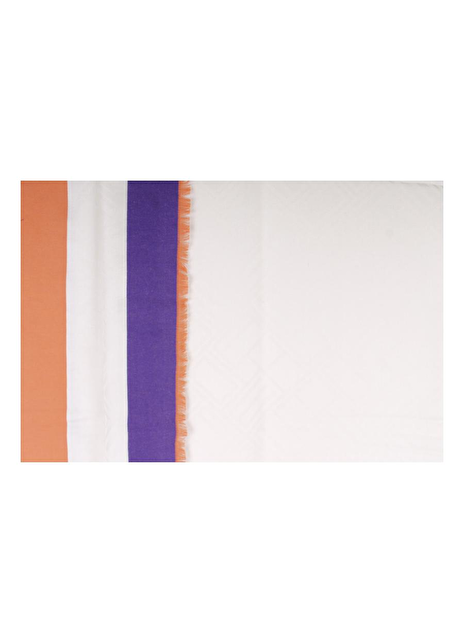 Shawl offwhite abstract geweven dessin met paars, oranje en zwarte strook. Etro peagasus logo.