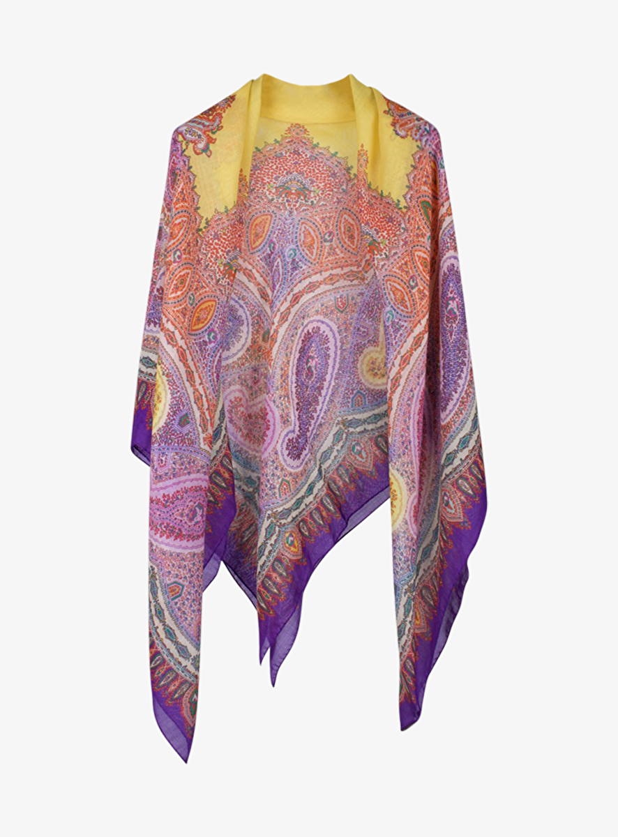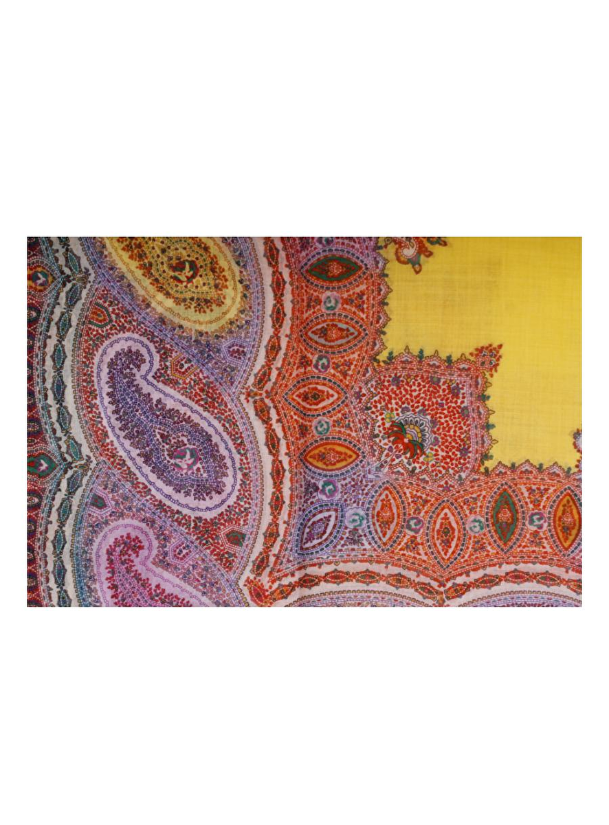 Detail: helder geel en paarse kleuren - paisley dessin.