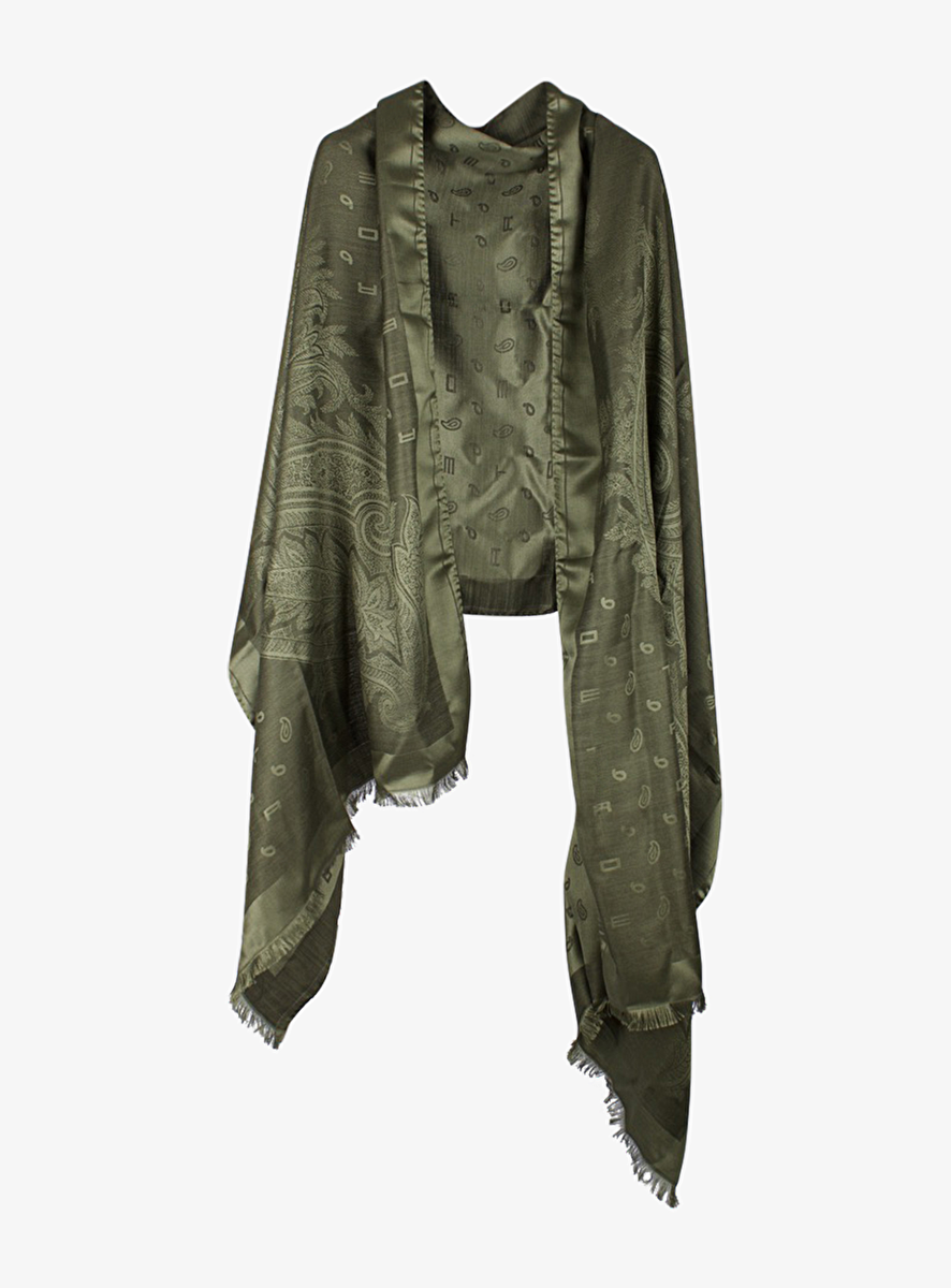 Mooie zachte olijfgroene sjawl met paisley print en letters van Etro.
