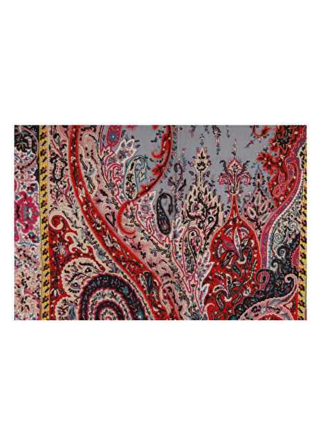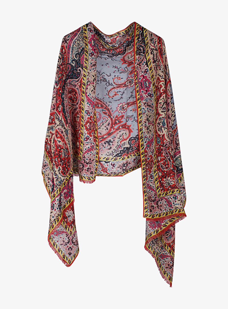 Shawl rood, roze, beige paisley dessin met neven kleuren geel, licht blauw en zwart. De zoom heeft een fijn randje.
