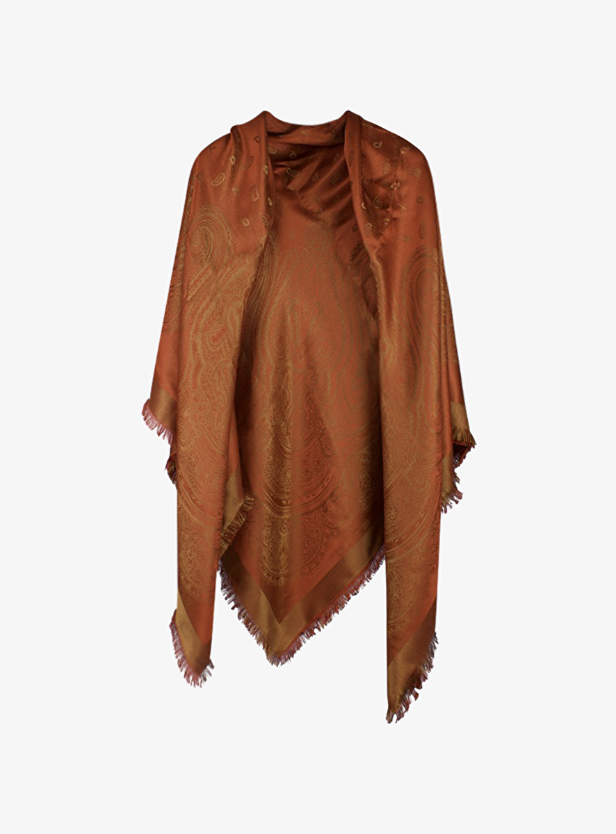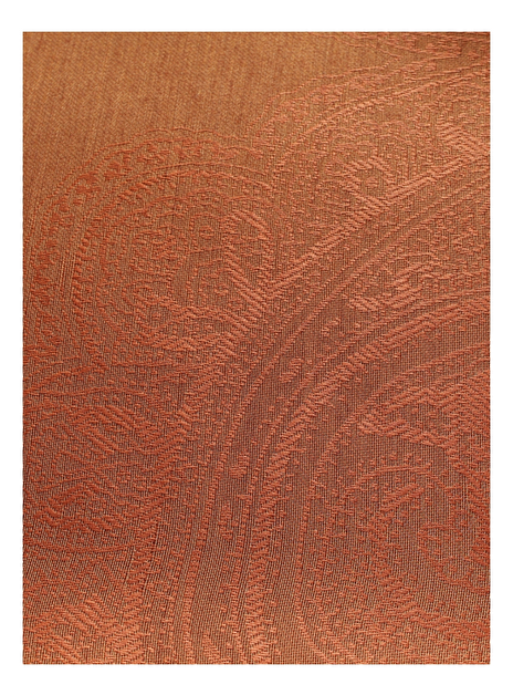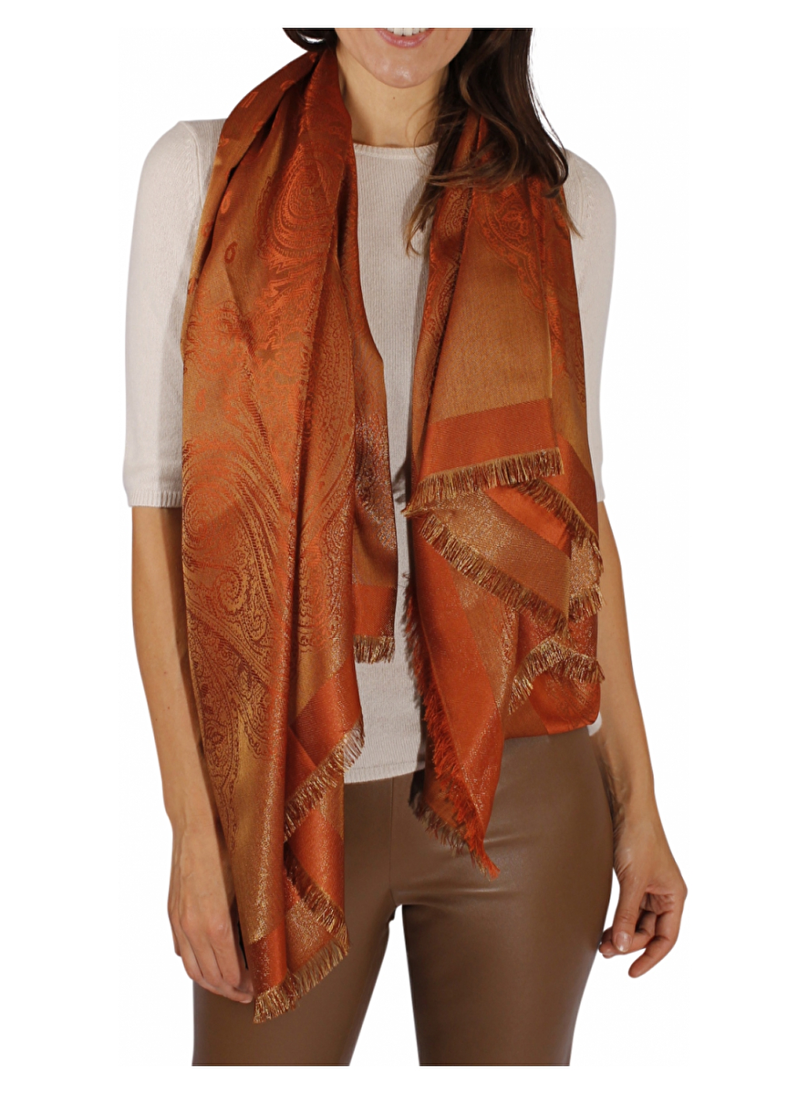 Prachtige shawl in een uni terra tint met goud draad, geweven in paisleyprint en fijne franje rand. De afmeting is 145cm x 145cm.
