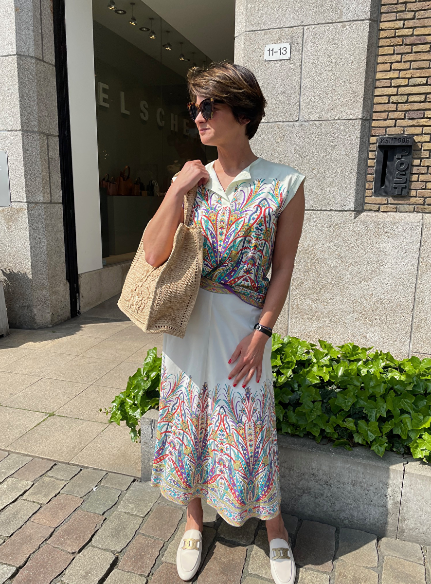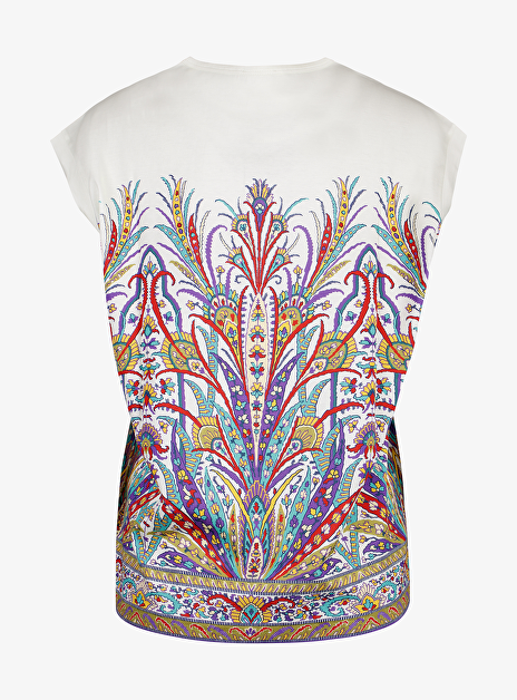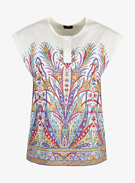 Detail: ronde hals - v-hals knoopsluiting - kapmouwen - print.