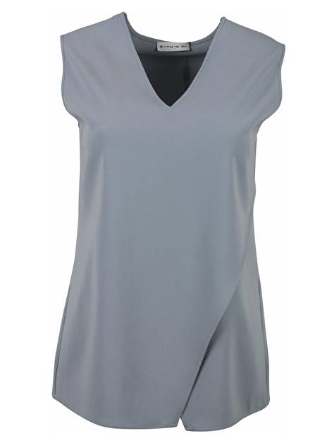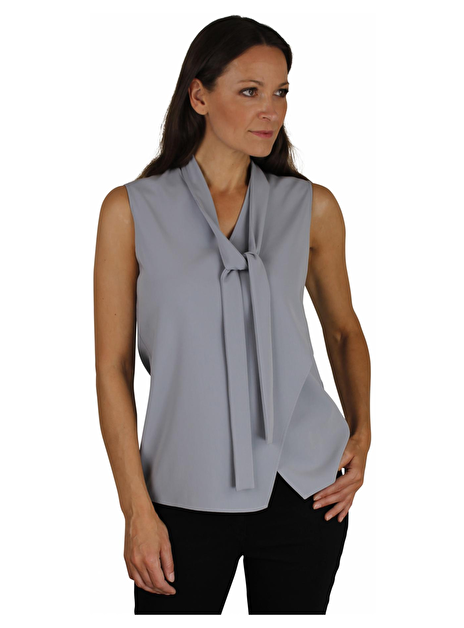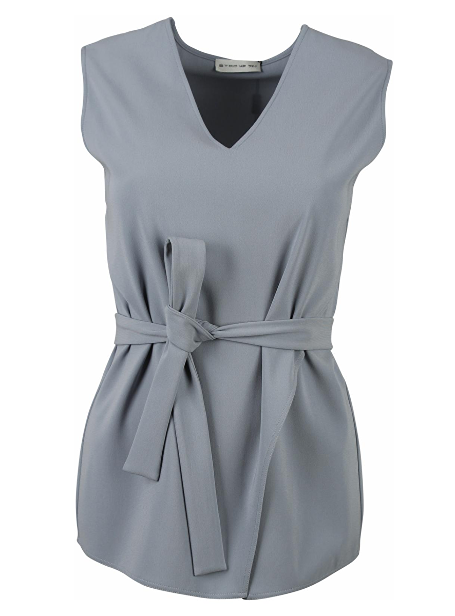 Ice blue top met V-hals. Deze top heeft geen mouwen en is van een mooie kwaliteit stof. De asymmetrische snit loopt naar de linkerkant en is zowel met als zonder de stoffen ceintuur te dragen. Bijzondere kleur! Andere look? Draag het bijpassend ceintuurtje als strik!