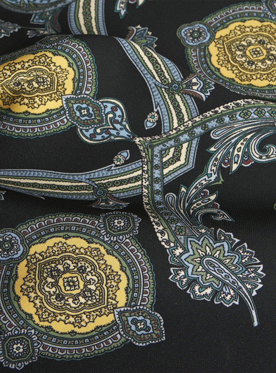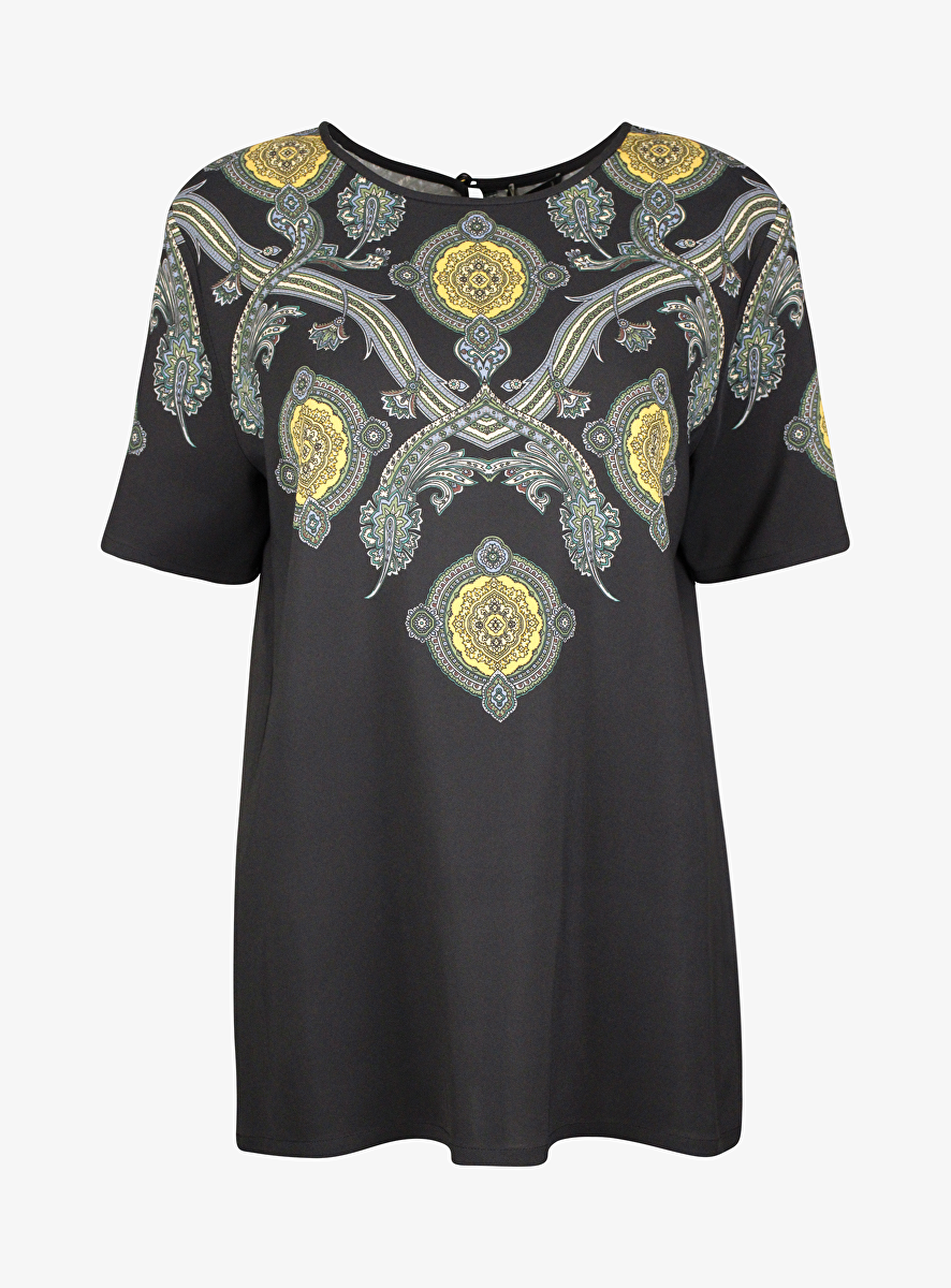 Detail: ronde hals - paisley print aan de bovenkant en schouders - korte mouw - lus en knoopje aan de achterkant.