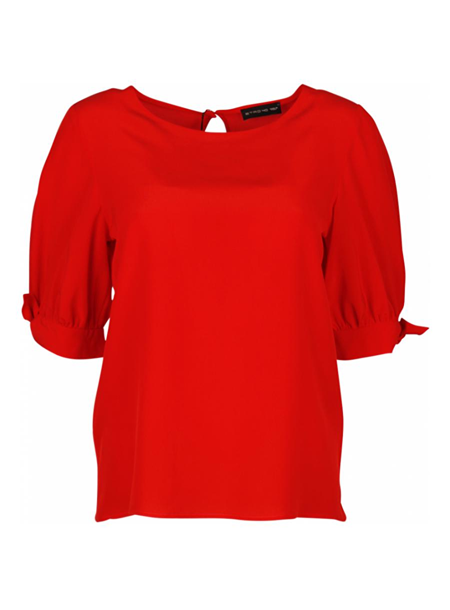 Deze zijde fel rode top heeft een ronde uitgesneden hals. De mouwen zijn afgewerkt met een strik of knoop wat tevens ook zorgt voor een pof model in de mouw. De top is recht slankvallend, wat zorgt voor een soepel en fijn draag comfort.