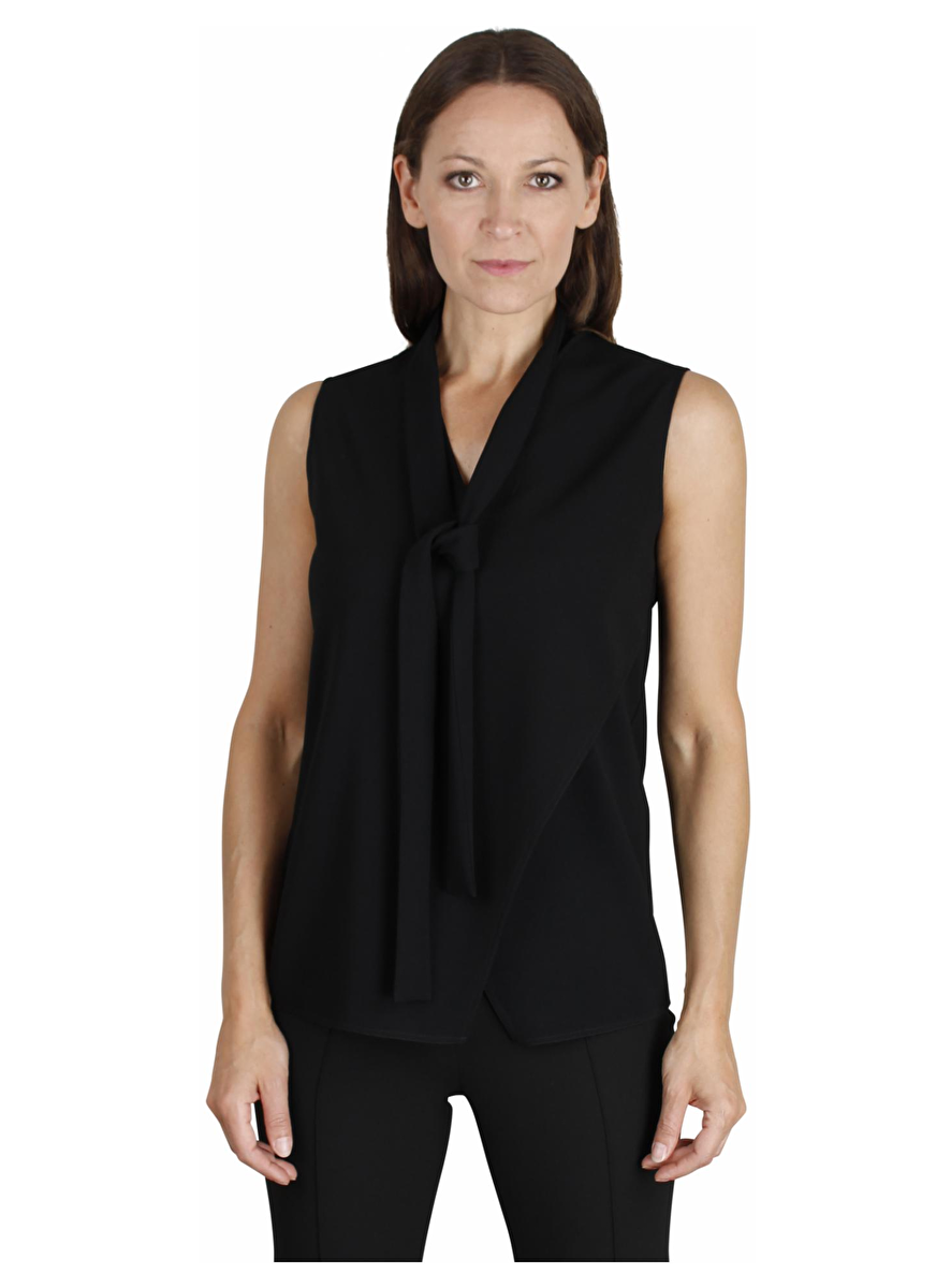 Asymmetrische zwarte top met V-hals. Deze top heeft geen mouwen en is van een mooie kwaliteit. De asymmetrische snit loopt naar de linkerkant en is zowel met als zonder de stoffen ceintuur te dragen. Wil je een andere look? Gebruik het accessoire als strik of strop...