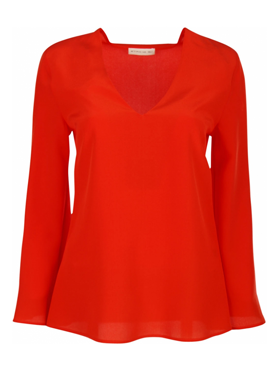 Prachtige top in rood zijde valt heerlijk soepel. De top heeft een v-hals en uiteenlopende mouwen wat een mooi effect geeft bij het dragen.