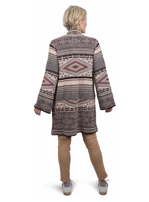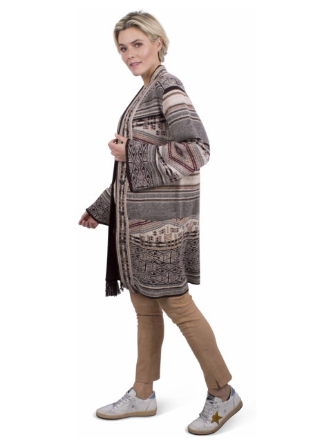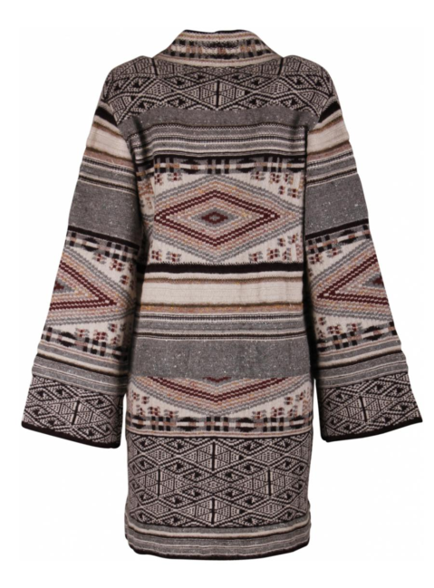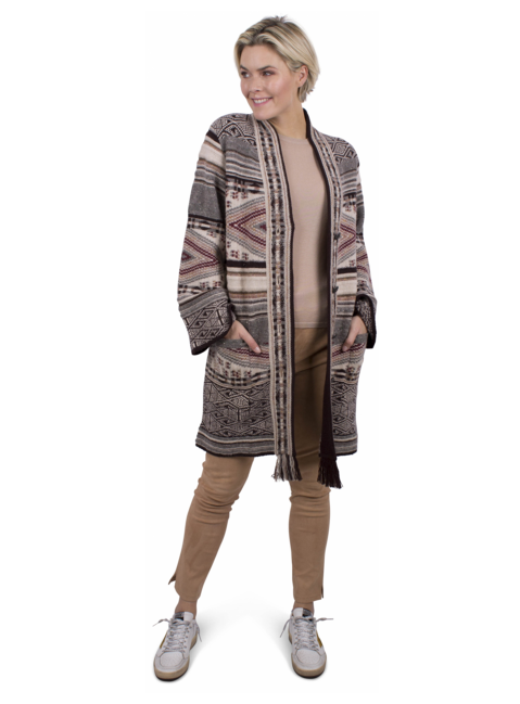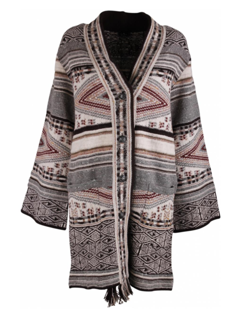 Vest in Azteken dessin bruin, rood, beige. Sierrand in de hals en knopenrand met aan de onderkant franjes. Twee grote zakken. Deze sluit met vier Etro paard logo knopen. Trompet mouwen.