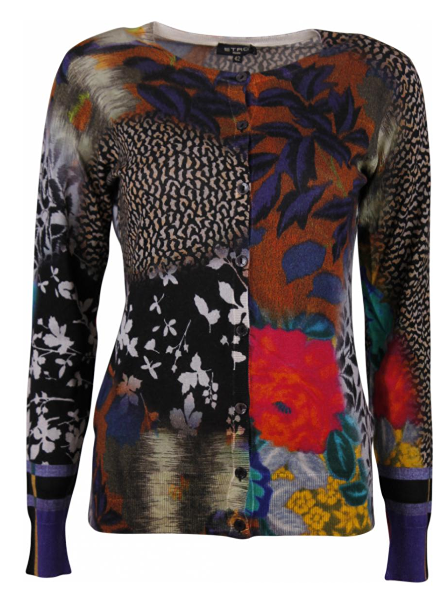 Zijde, cashmere vest met ronde hals, knoopsluiting en lange mouwen. De hoofdkleur is zwart afgewisseld helder fel roze, aqua, blauw en paars tinten.