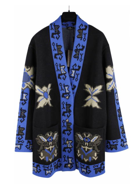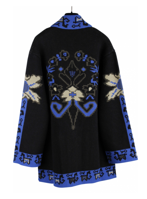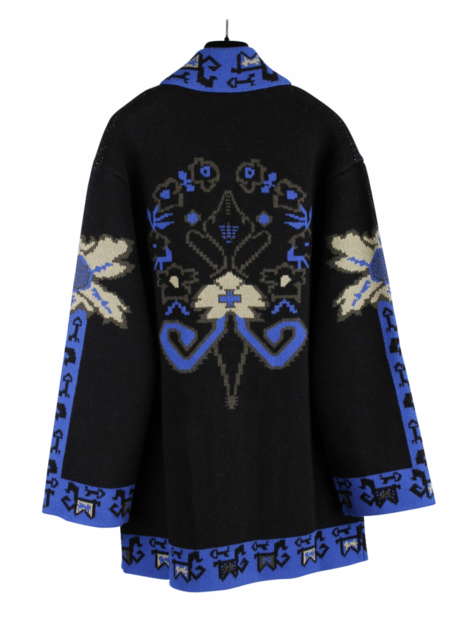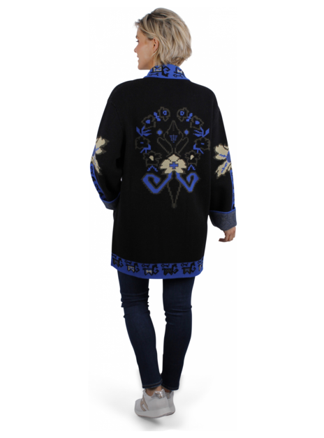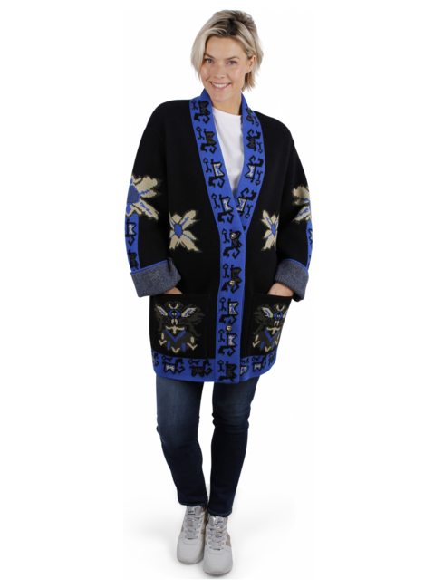 Vest met abstract dessin blauw, geel en zwarte halslijn. Het dessin loopt over de mouwen, voorkant en achterkant. Zakken. Knopen met goudkleurig logo.
