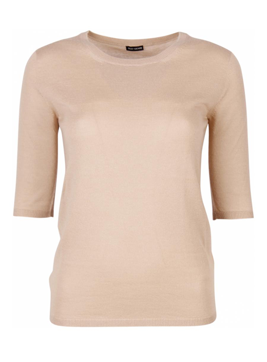 Fijne pull in beige met ronde hals en korte mouwen tot aan de elleboog. Mooi boven een jeans of pantalon en heerlijk onder een vest. Een stijlvolle basis.