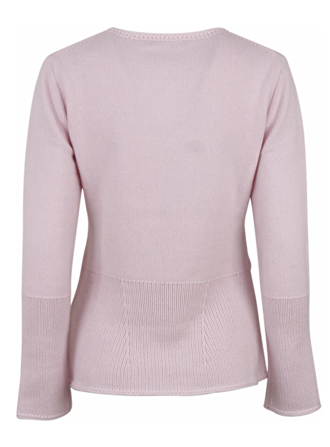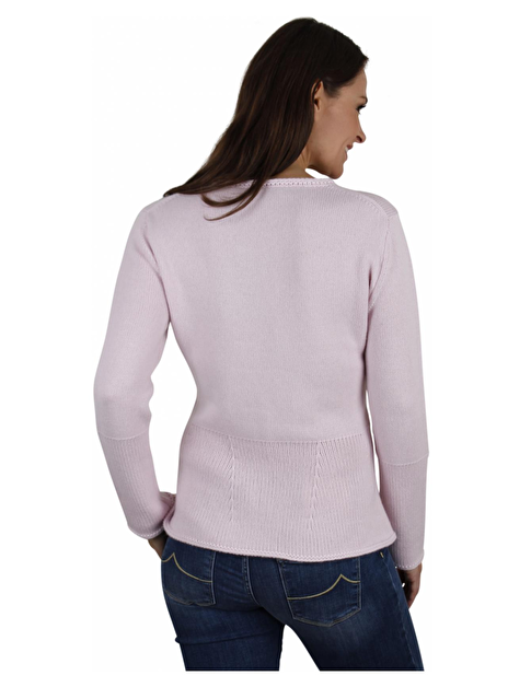 Pull licht roze met ronde hals, brede manchetten en boord in een grove steek.