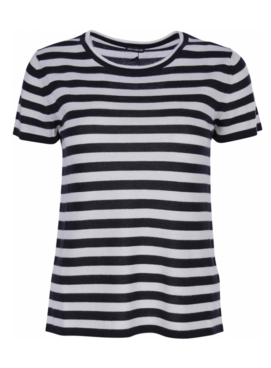 Pull met korte mouw. De kwaliteit is 100% cashmere en de streep is marine met wit.