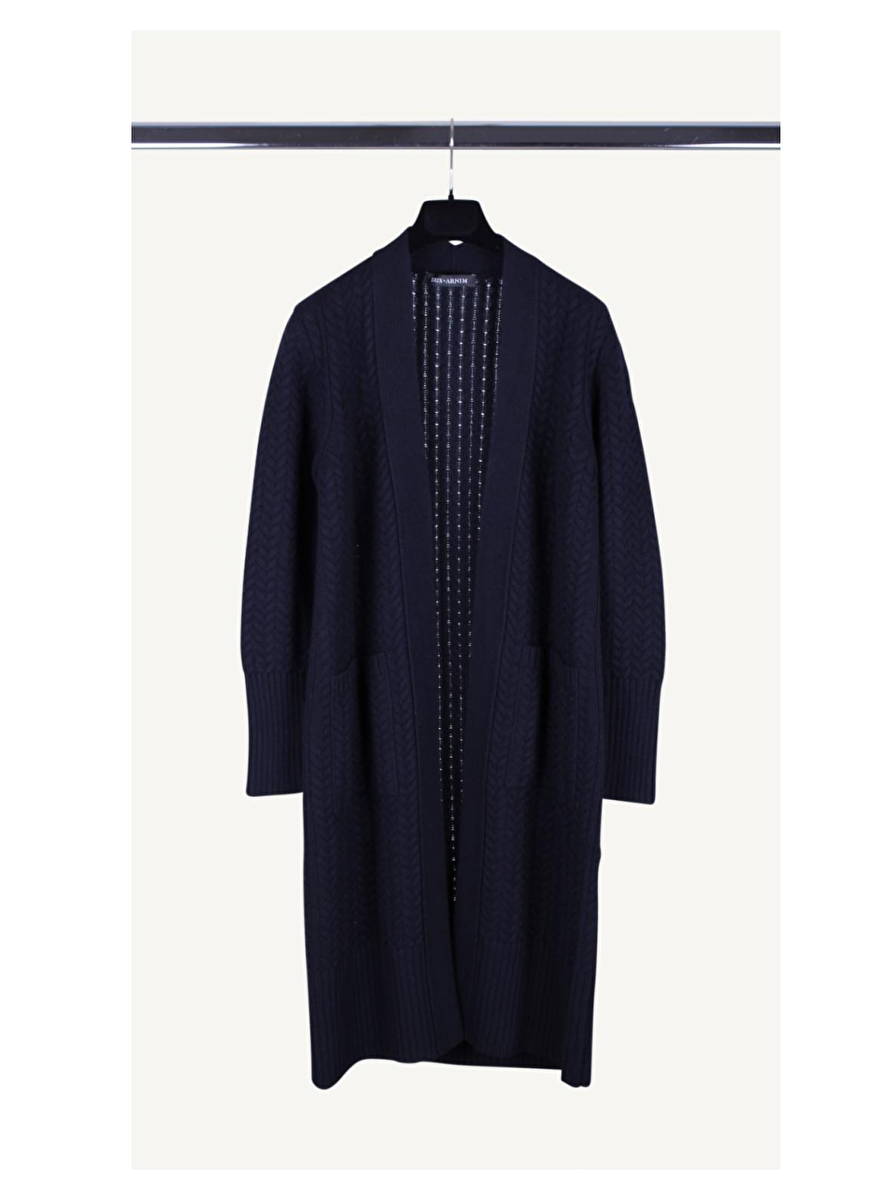 Vest Augustine marine, vlechtbrei motief en grote zakken. De manchetten zijn smal aansluitend.