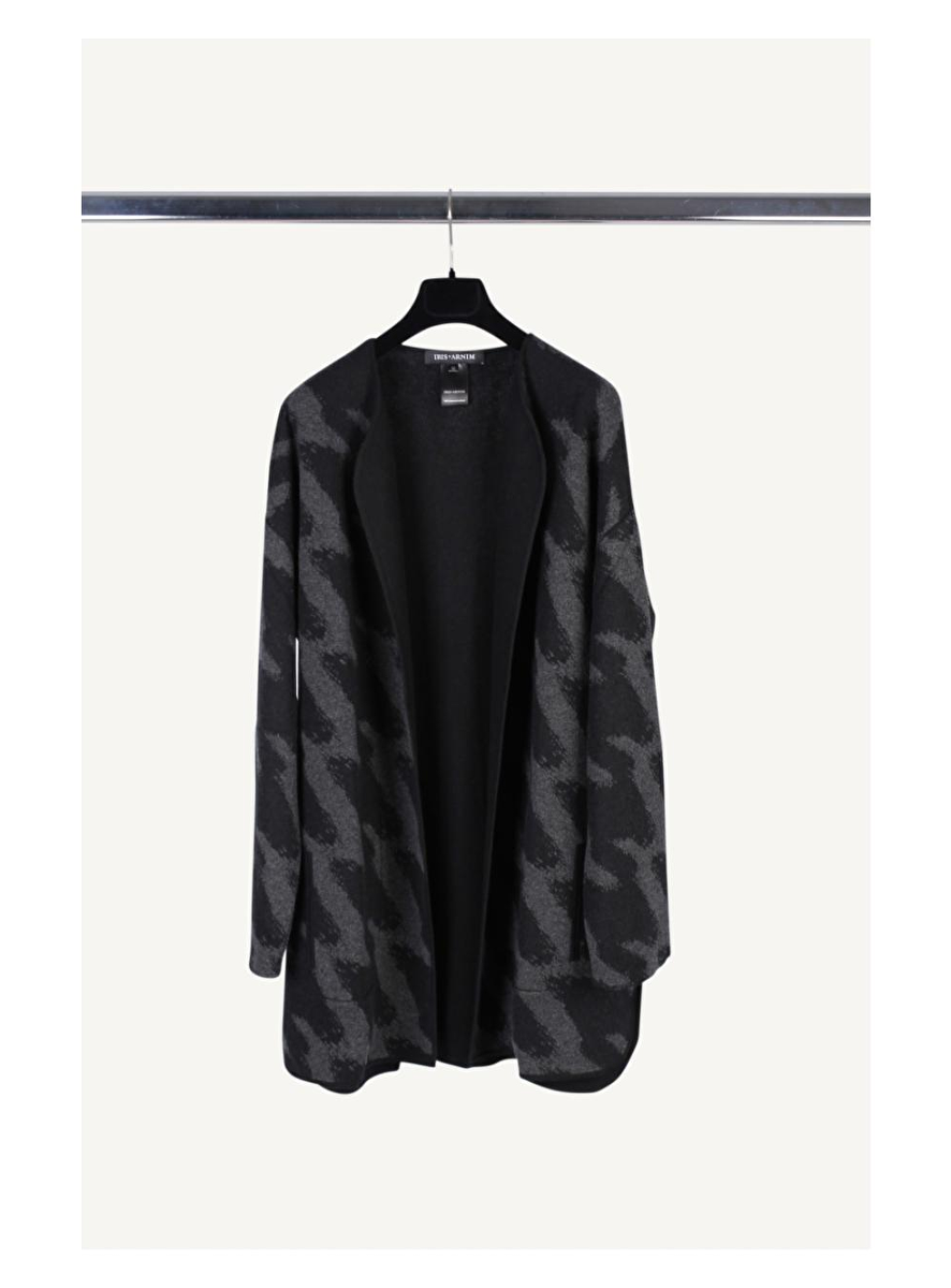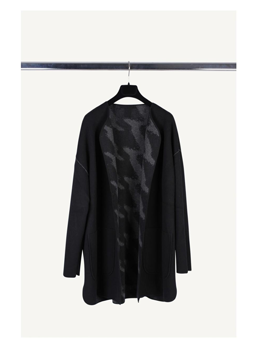 Het double face vest is niet weg te denken bij Iris von Arnim. Het zijn ook allemaal bestsellers en waarom? Wat is het geheim? Heel simpel, ze zijn prachtig dus je voelt je prachtig maar ze zijn ook zeer draagbaar. Vroeg in het seizoen ga je ermee naar buiten en in de winter draag je ze binnen als jasje. En wat een leuke kleur ook weer, de ene kant is zwart en de andere kant is een print in zwart/grijs. Het vest is kraagloos en ruimvallend.