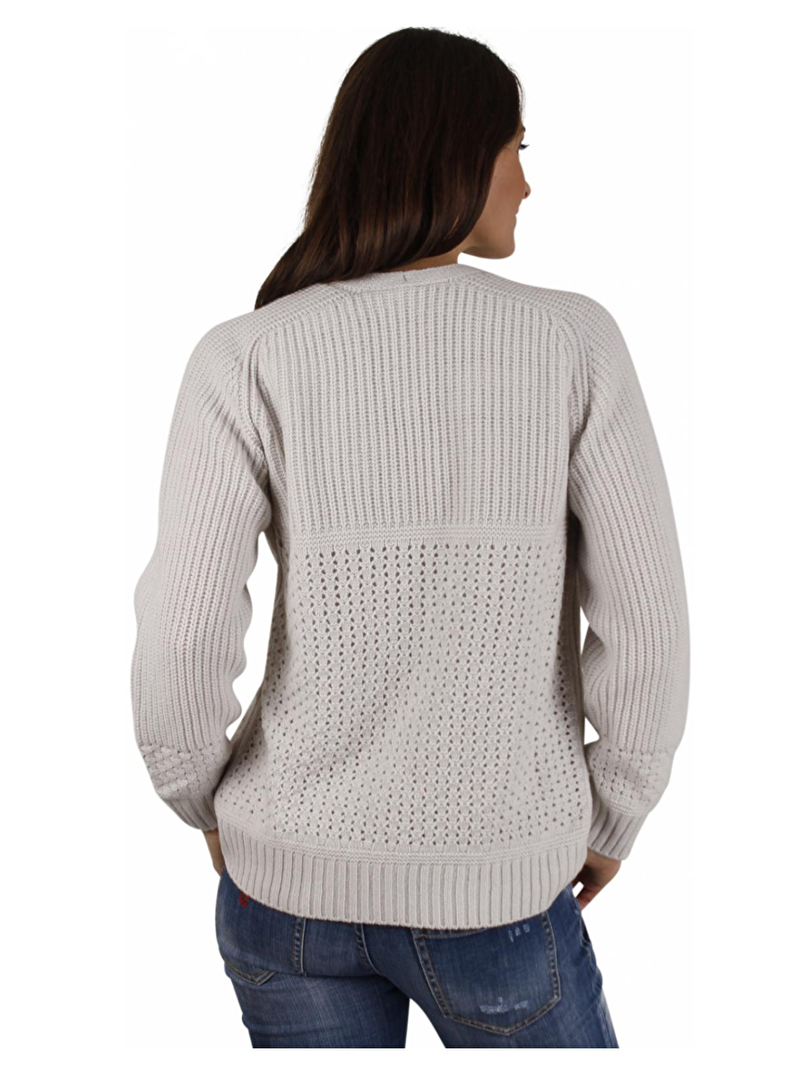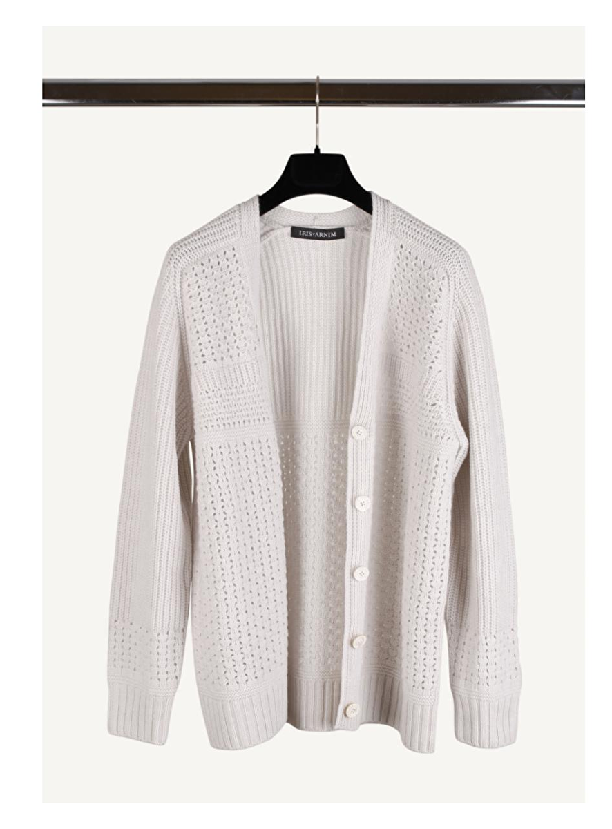 Vest in beige met v-hals luchtig abstract gebreid. Deze sluit aan met vijf knopen.