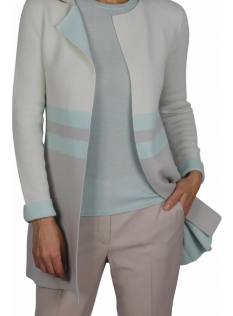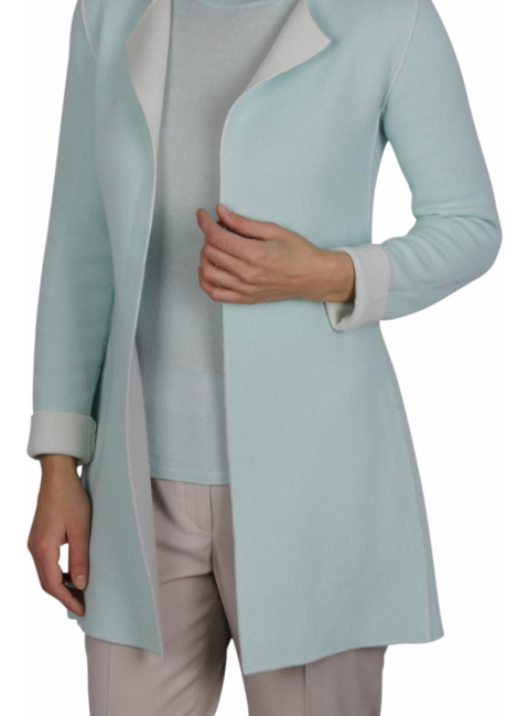 Mooi dubbelzijdig te dragen (double face) vest. De kleur is mintgroen met lichtgrijs en kiezel. Het vest heeft een groene kant (mint) en een kiezel met grijs en groene strepen. Het vest is mooi getailleerd wat aan de groene kant een bewerkte naad geeft. De halslijn is rond en loopt over in een rever. Het vest is slankvallend. Doordat het vest aan beide kanten draagbaar is kan het mooi gecombineerd worden. Altijd een stijlvolle uitstraling.