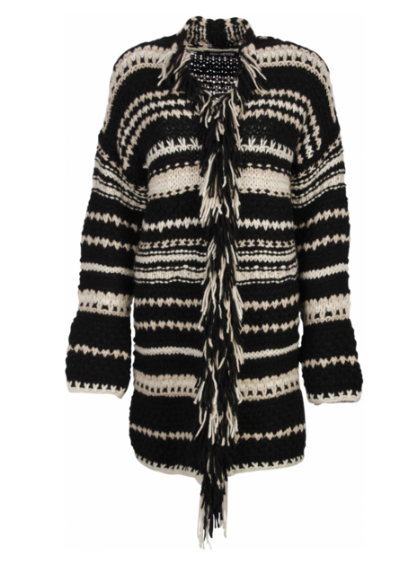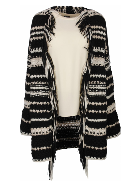 Vest grofgebreid uitgevoerd in zwart gecombineerd met offwhite en beigekleurige banen. Dit waanzinnig mooie vest is echt een eyecatcher en heeft een hele mooie slanke pasvorm. Door de franjes en het grove breisels ontstaat er een nonchalant en draagbaar vest maar wel met een luxe uitstraling. Het materiaal bestaat uit 100% zuiver cashmere.