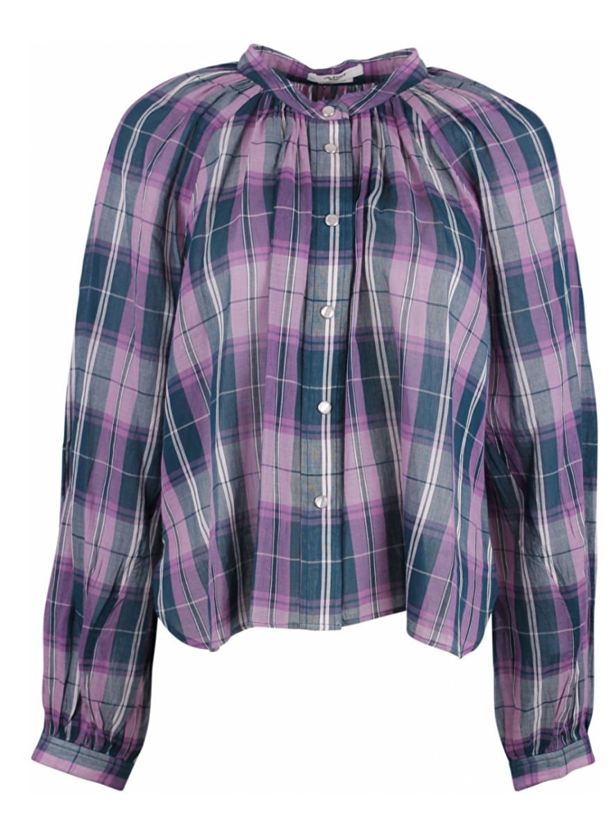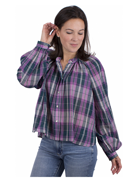 Luchtige blouse geruit met een ronde hals. Parelmoer drukknopen. Ballonmouwen en klein manchet met drukknoopje. Afgeronde zoom.