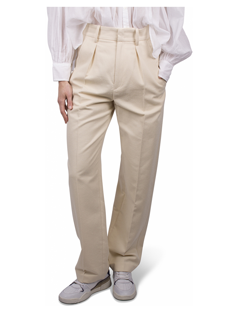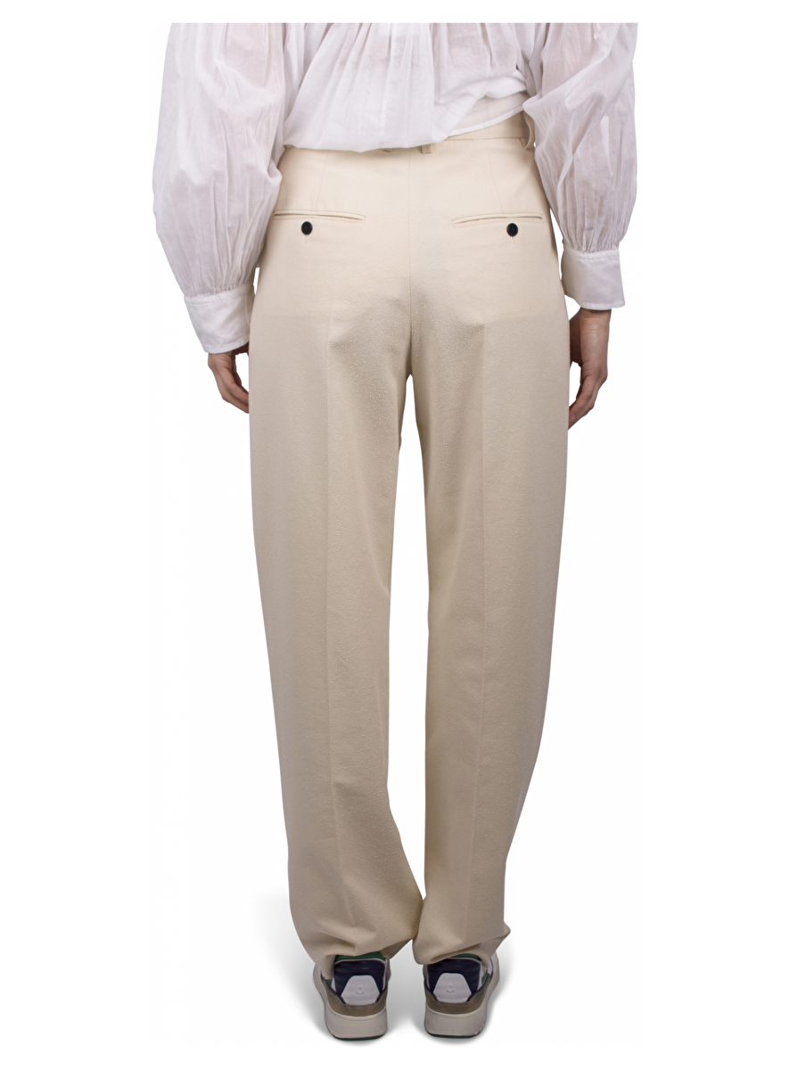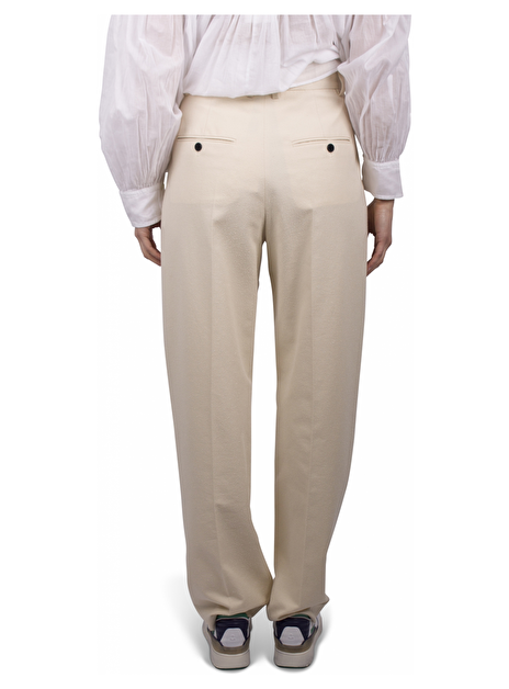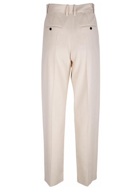 Ecru bandplooibroek met structuur en persvouw. Steekzakken. Ceintuurlussen. Zakken achterkant met knopen.
