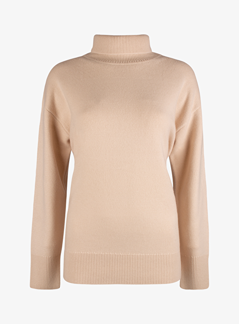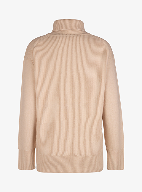 Detail: hoge col - glad gebreid aan de voorkant - rib gebreid aan de achterkant.