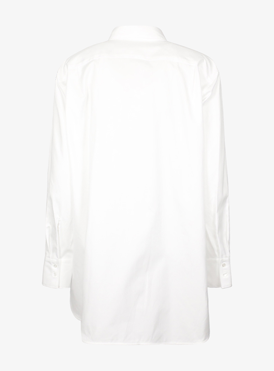 Detail: kraag - knoopsluiting - grote rechthoekige borstzak - afgeronde onderkant zoom, de voorkant valt 5 cm korter.