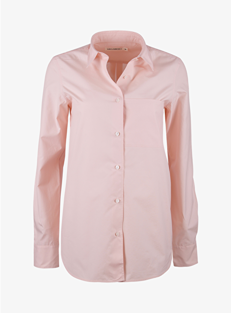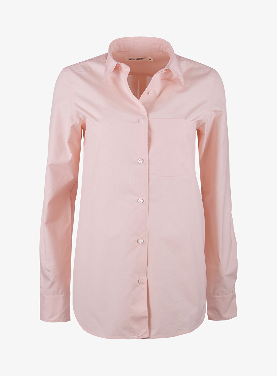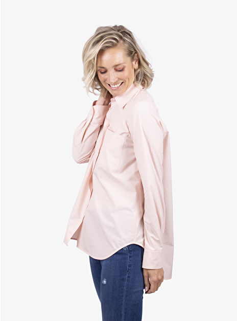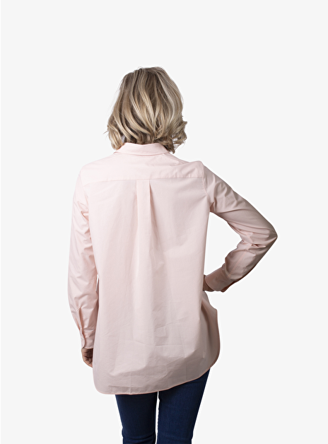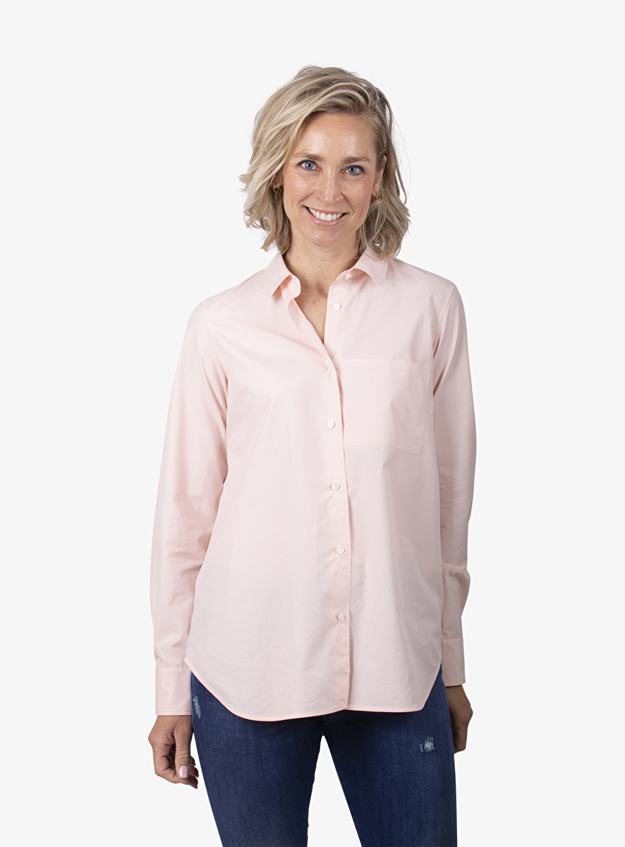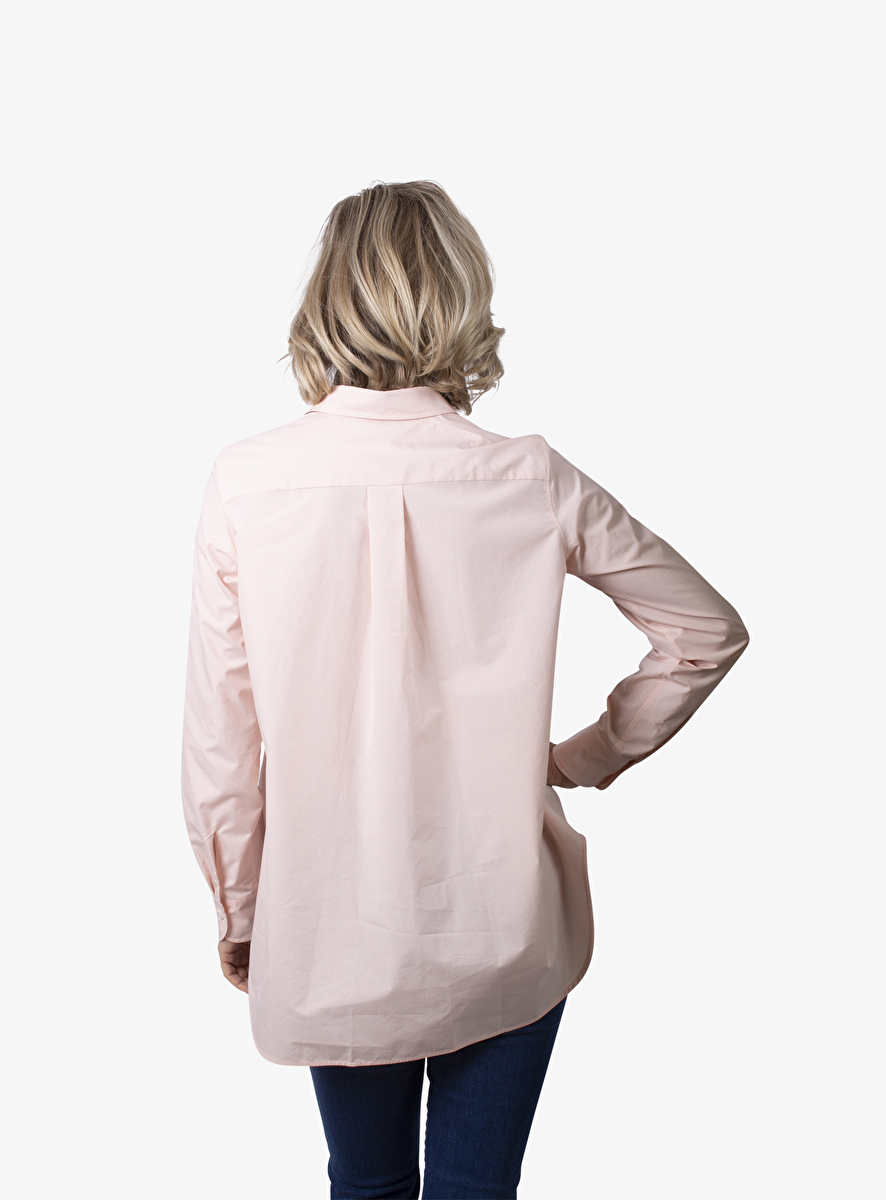 Detail: blouse met een grote borstzak verwerkt in de sluiting en een afgeronde zoom - manchetten met knoop - stolpplooi aan de achterkant.