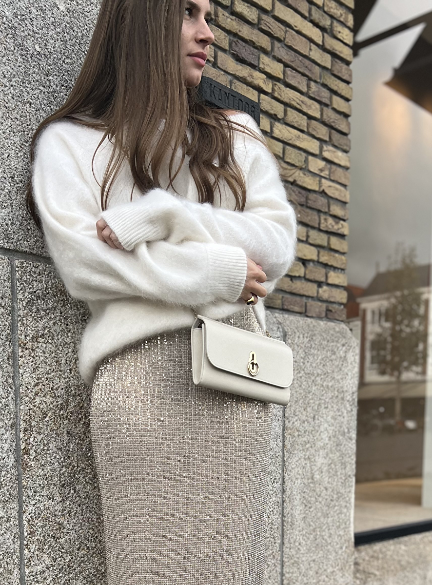 Geïnspireerd door de glans van mohair, creëert de geborstelde kasjmiertechniek een zacht en donzig breisel dat licht en luchtig aanvoelt.