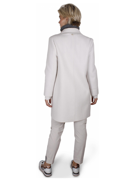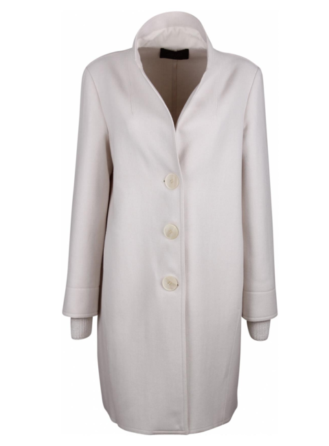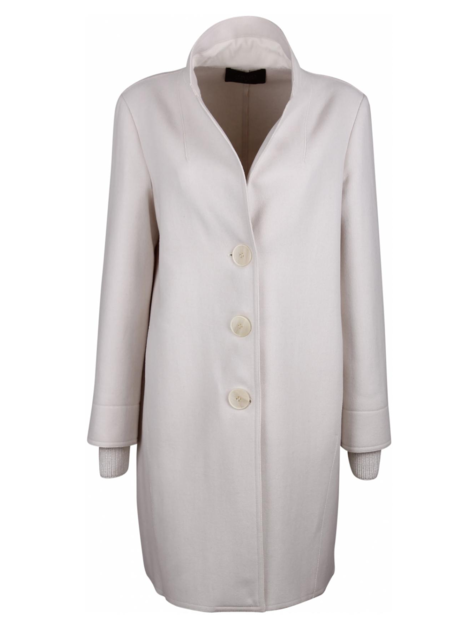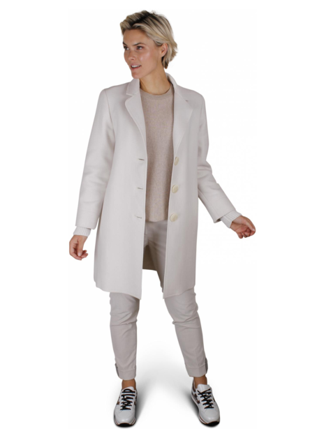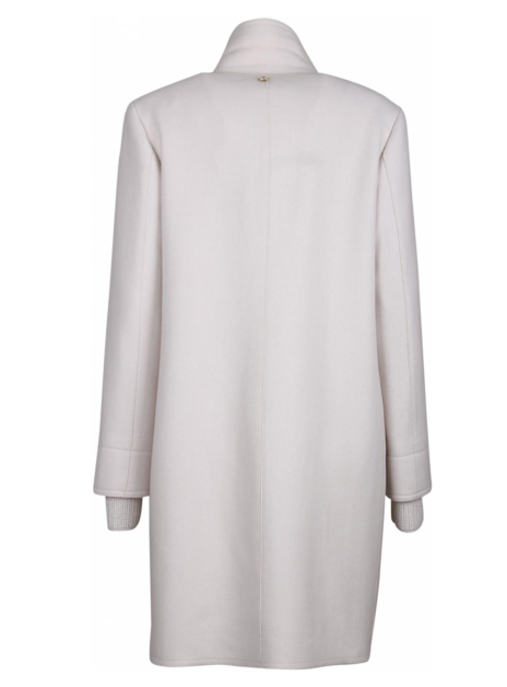 Wollen jas met rever, drie grote knopen, zakken in de detailnaad en een gebreid goud, zilver offfwhite manchet.