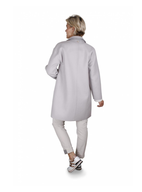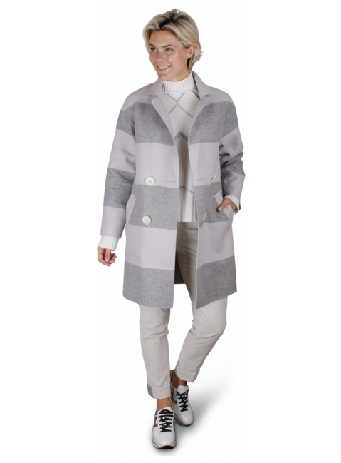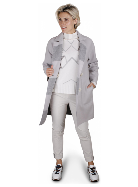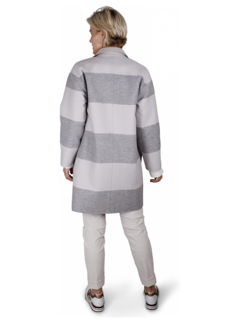 Wollen jas met rever en gebreide rand, vier knopen, grote zakken, grijs/kiezel gestreept en kiezel aan de andere kant, dus dubbelzijdig draagbaar.