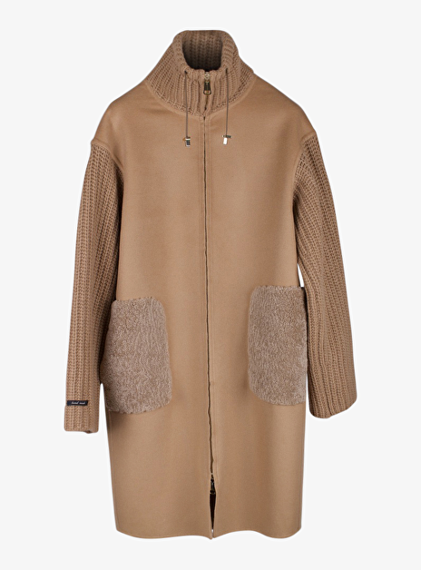 Detail: gebreide kraag, mouwen - teddy zakken - PU leder koord met goudkleurige stiften en stoppers.