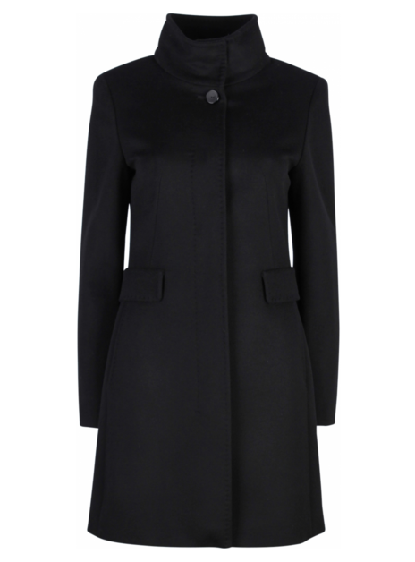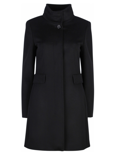 Elegante zwarte halflange jas van 100% wol. Jas kan gesloten worden door middel van knopen. Jas heeft ook een kraag die tot boven toe dicht kan worden gedragen met drukknopen. Aan de voorzijde twee zakken en aan de achterkant een split. De voering is polyester 100%. Aan de mouwen nog drie sierknoopjes. Valt klein! Deze maat 44 valt als een 42.