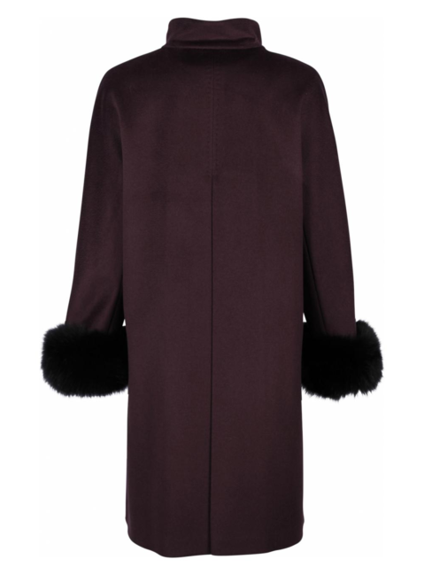 Wat een dotje deze wollen coat van MaxMara. De kleur is diep aubergine/berry. De kraag is opstaand dus heerlijk warm in de winter en de mouwen hebben een manchet van bont in zwart. De jas is prachtig afgewerkt met een zadelsteek, een opvallende steek bovenop de stof in dezelfde kleur. De achterkant heeft een verrassing, vanuit de kraag een grote stolpplooi. Zeer vrouwelijke jas. Steekzakken en drukknopen als sluiting maken de jas helemaal af.