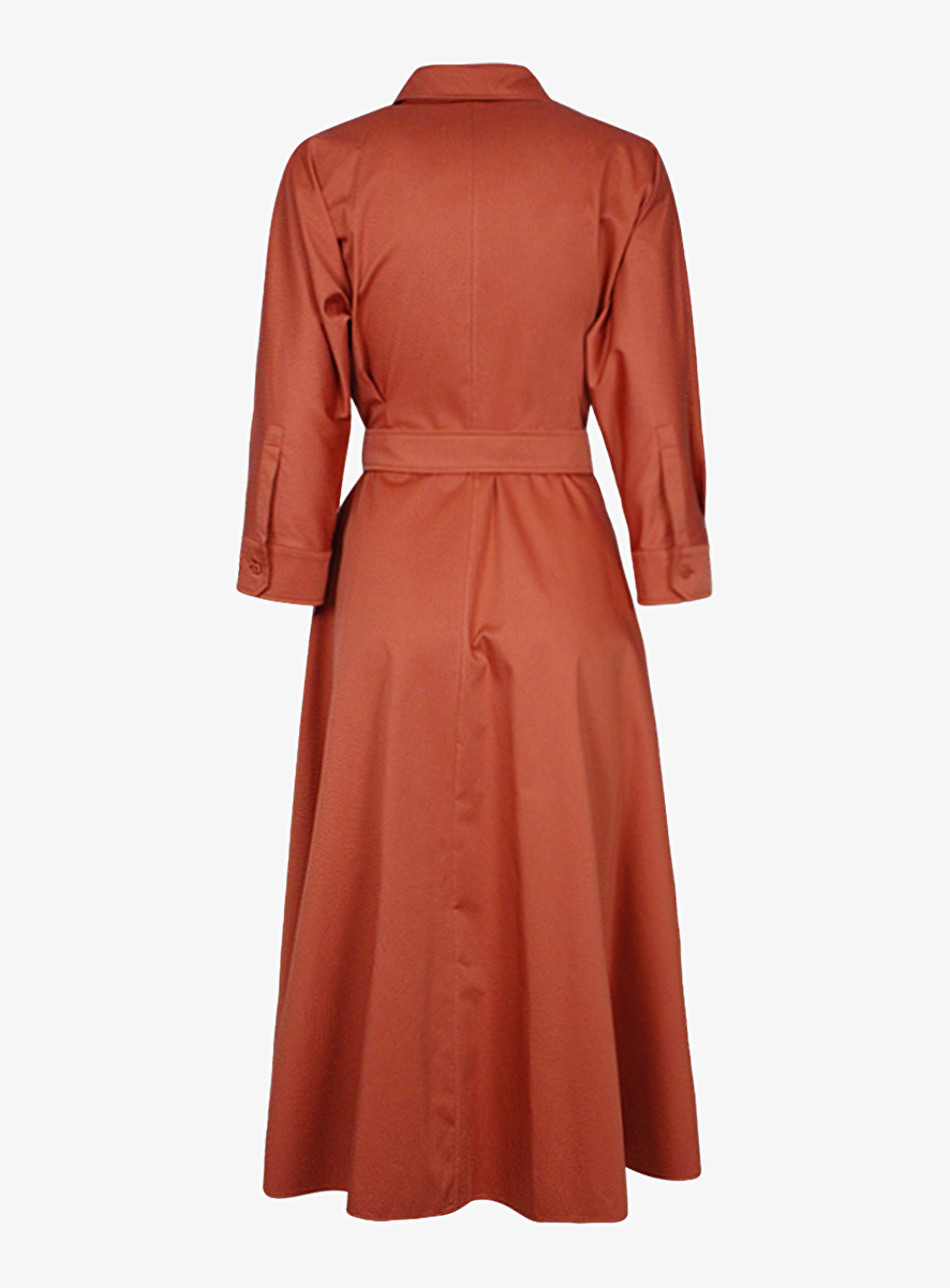 Detail: kraag - blinde doorknoopsluiting - stoffen ceintuur - klepzakken met leder gesp - 3/4 mouwen met manchet en knoop.