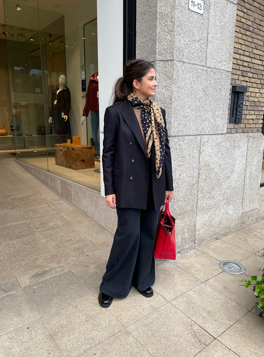 Shawl carre zijde camel zwart dot dessin