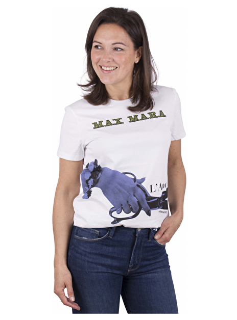 Shirt met een ronde hals en lavendelblauw, zwart schaar logo print. Letters zwart groen.