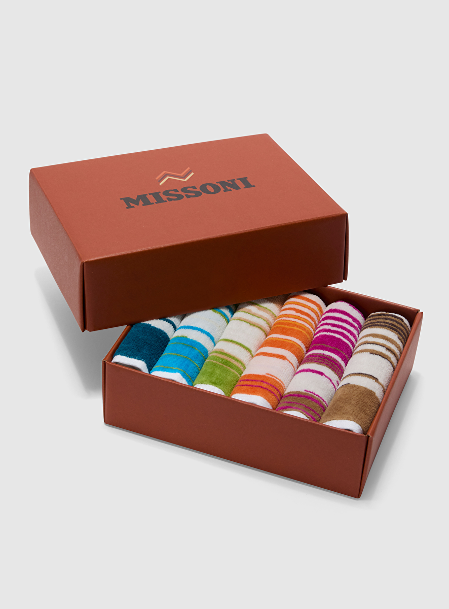 Deze set van zes face towels combineert stijl en functionaliteit. Ze zijn gemaakt van 100% zachte katoen en afgewerkt met verfijnde details. Met de Fiammetta gezichtshanddoeken van Missoni transformeer je alledaagse momenten in een stijlvolle ervaring. De set zit verpakt in een luxe Missoni-geschenkdoos en is dus ook perfect om cadeau te geven.