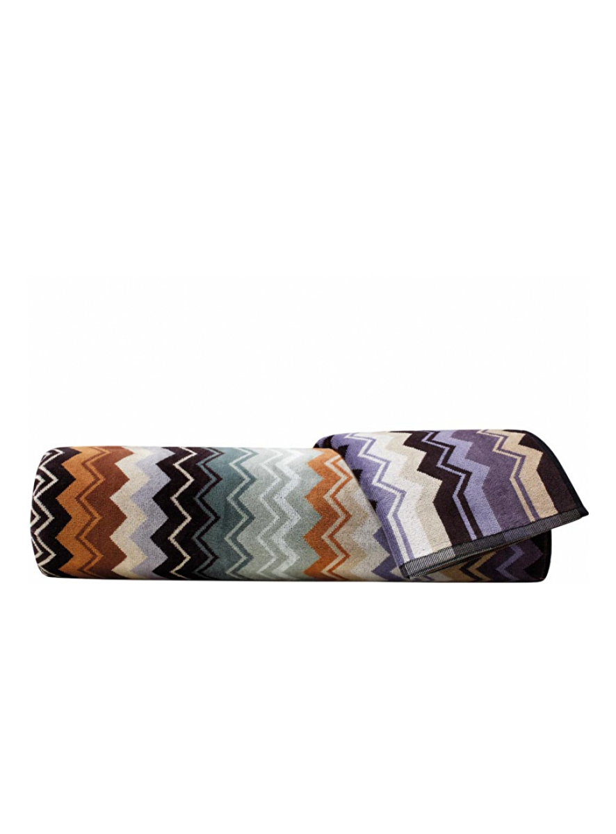 Missoni Home handdoeken Giacomo 165 hebben het bekende zigzagpatroon in fraaie bruine en lila tinten.