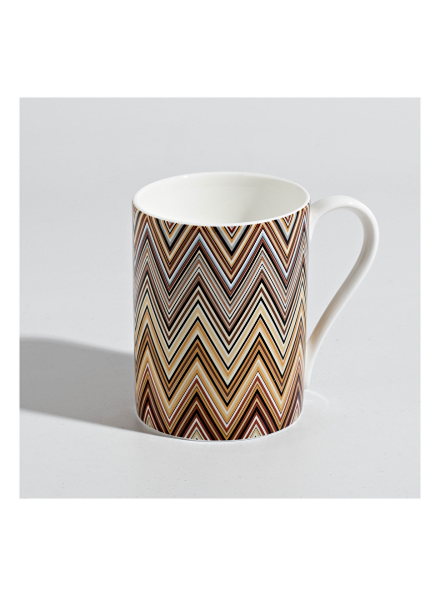 Licht beige, veelkleurig, porselein, zigzagprint, cilindervormig design, open bovenkant, een oor aan de zijkant.