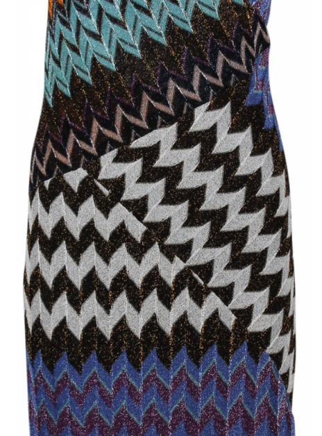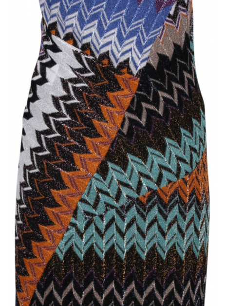 Jurk v-hals zigzag dessin met een glitter zilver, orange gold effect. Diagonale inzet en plisse. Hoofdkleuren zijn: zwart, oranje, blauw, groen. Zacht zijde zwarte onderjurk.
