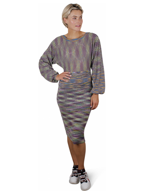 Jurk paars, blauw en multicolor. Boothals. Lange mouwen met elastisch manchet. Lijfje verticaal gestreept. Rok horizontaal gestreept.