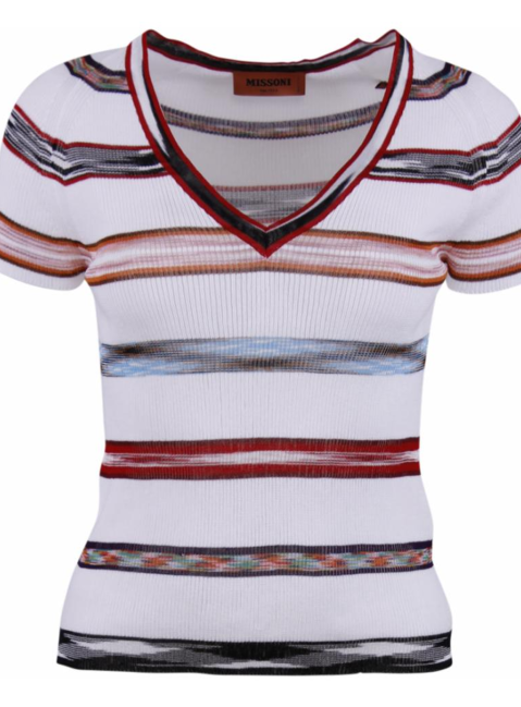 Top in wit met multicolor. Deze is horizontaal gestreept, heeft een diepe v-hals en korte mouwen.